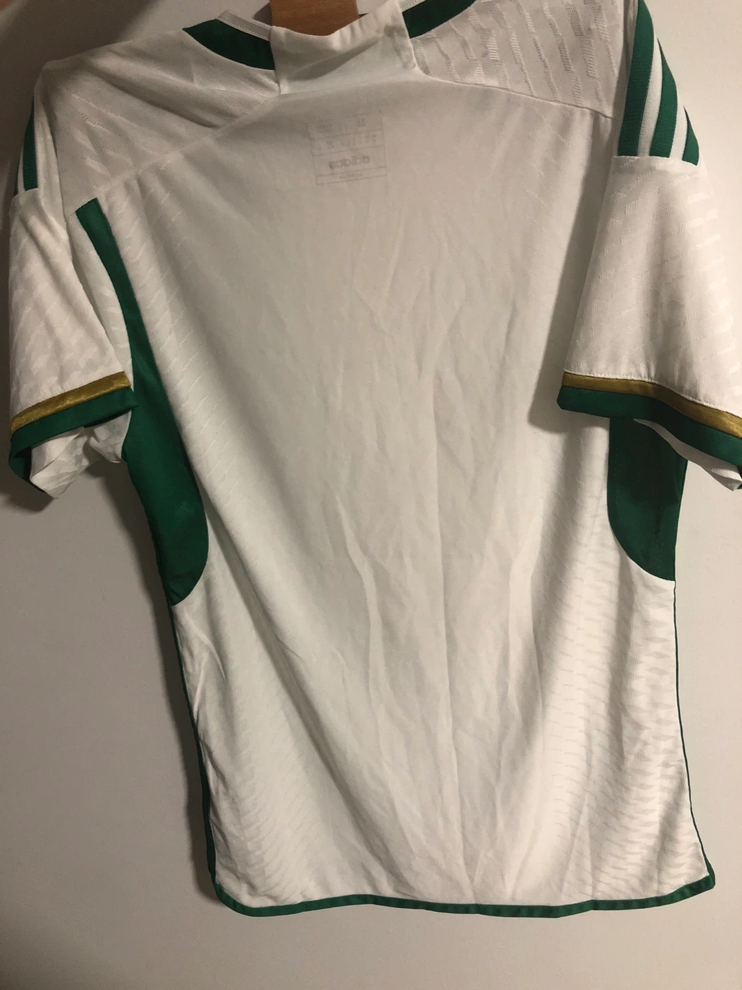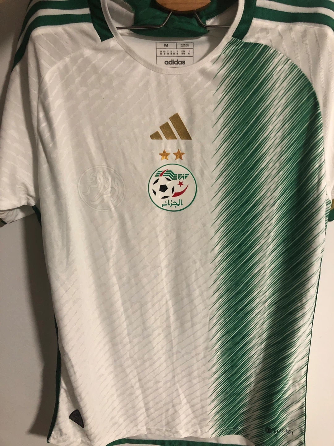 This is an Adidas soccer jersey for the Algeria national team. It's a size medium with a slim fit. The material is lightweight and breathable, perfect for playing or cheering. Price is negotiable