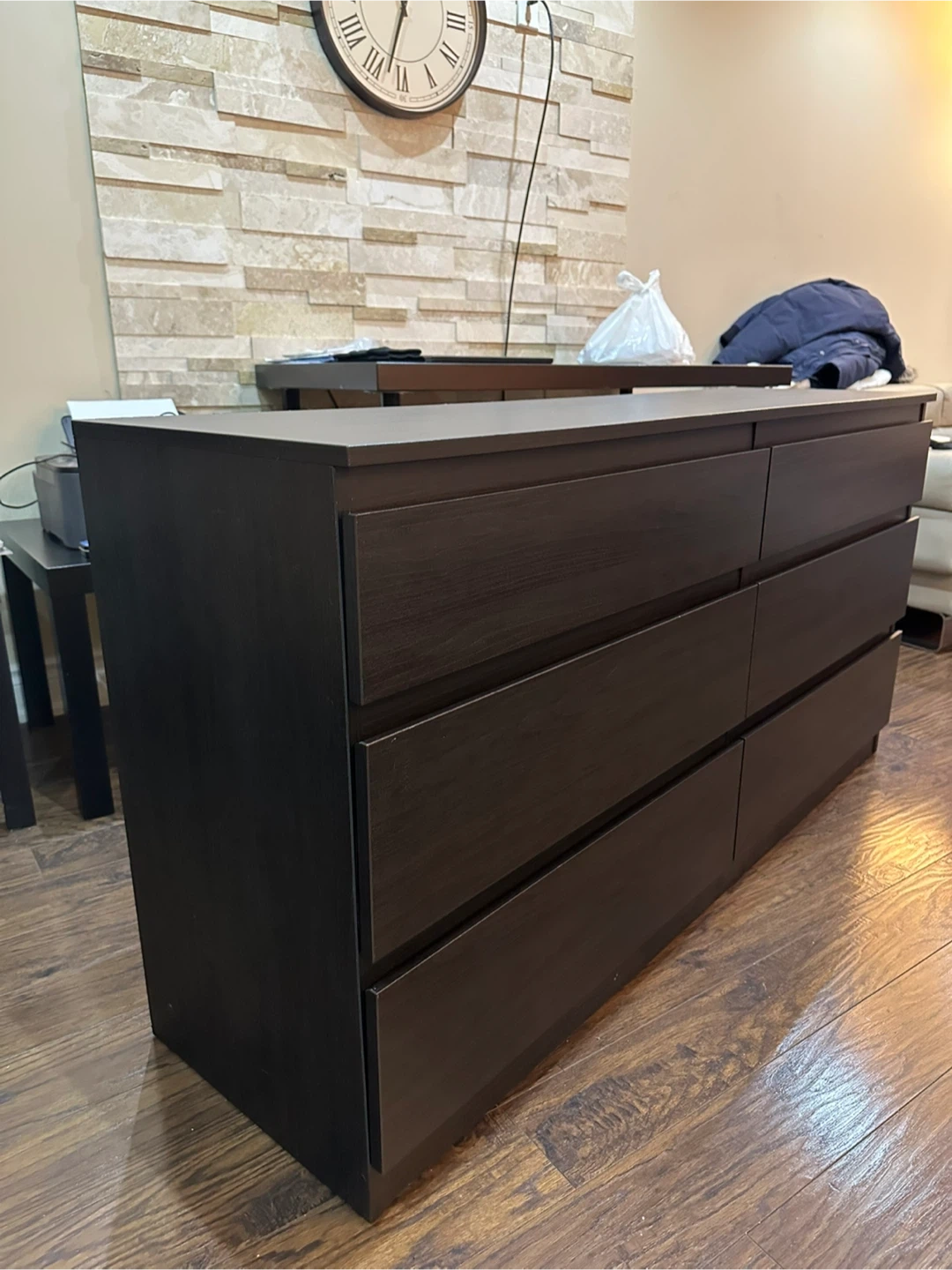 Dark brown 6-drawer dresser from IKEA. Made in Poland. Measures approximately 28" high, 55" wide, and 15.5" deep.