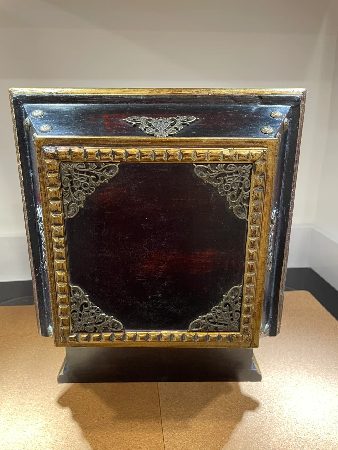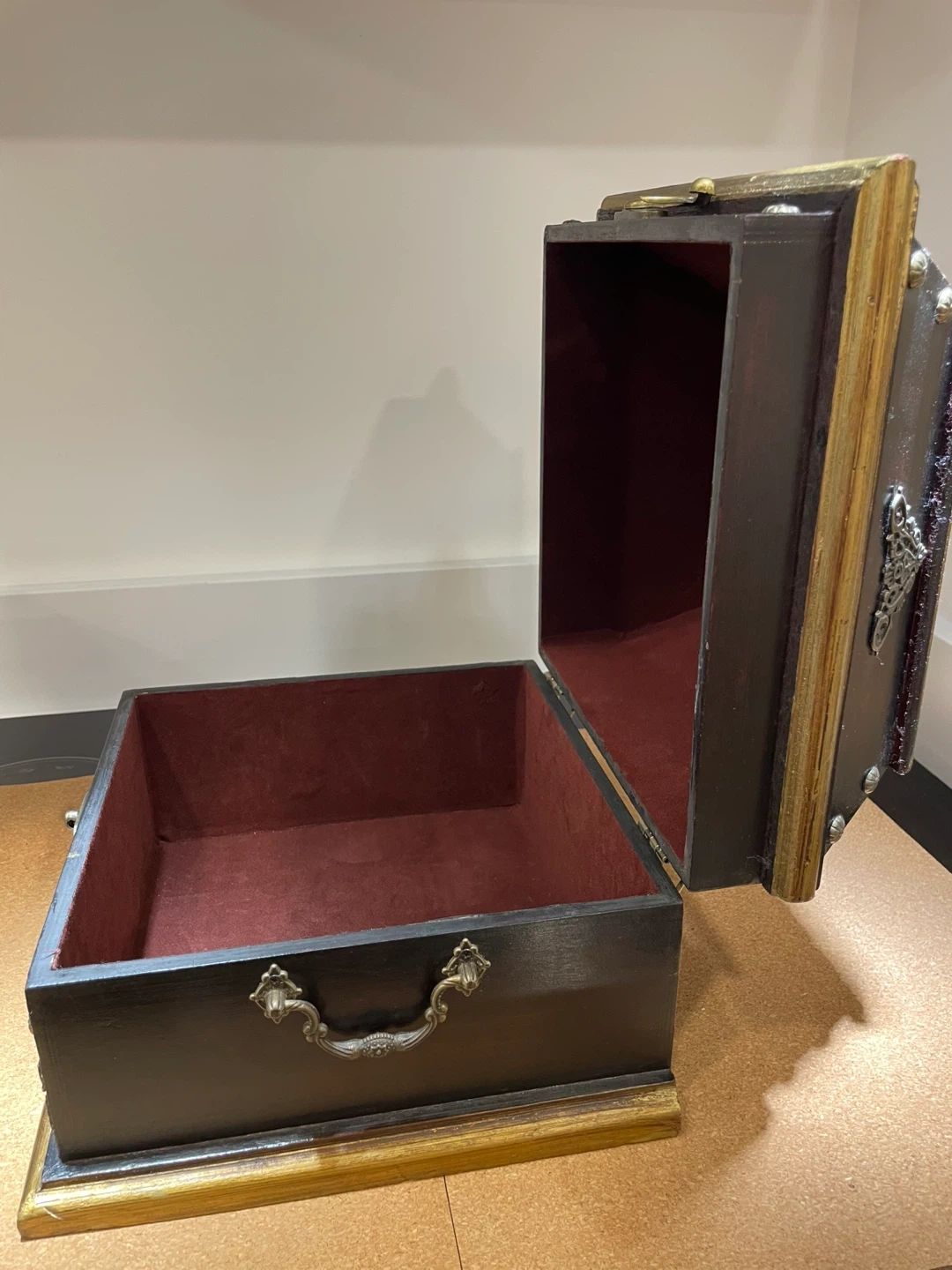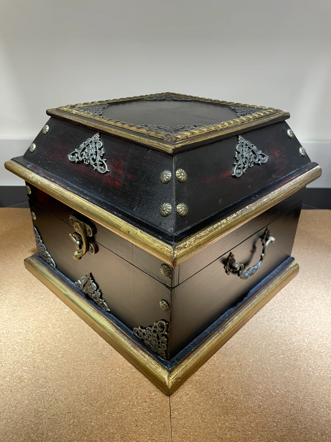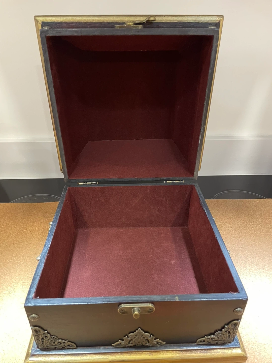 This is a decorative wooden box, featuring a rich dark wood finish with ornate gold-toned metal detailing. It has a hinged lid and a velvet-lined interior, along with a metal handle on the front. This box would be great for storing small treasures or keepsakes!