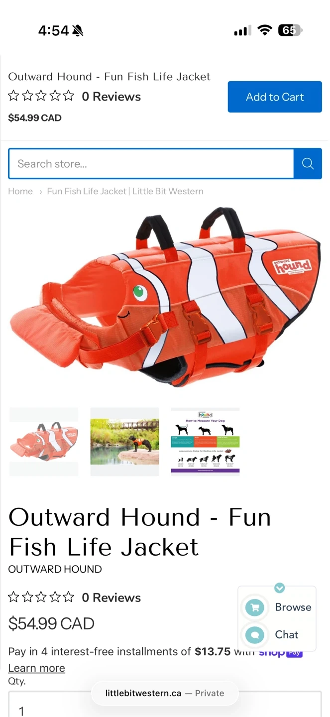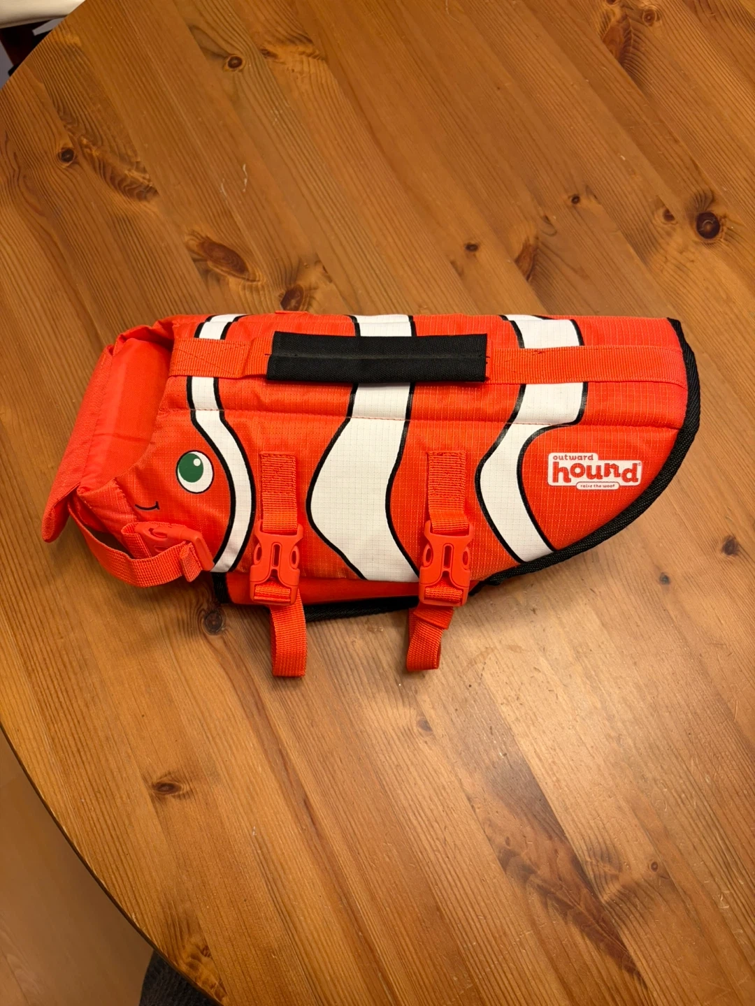 This is an Outward Hound Fun Fish life jacket for dogs. It's a size small. Made with polyethylene foam.