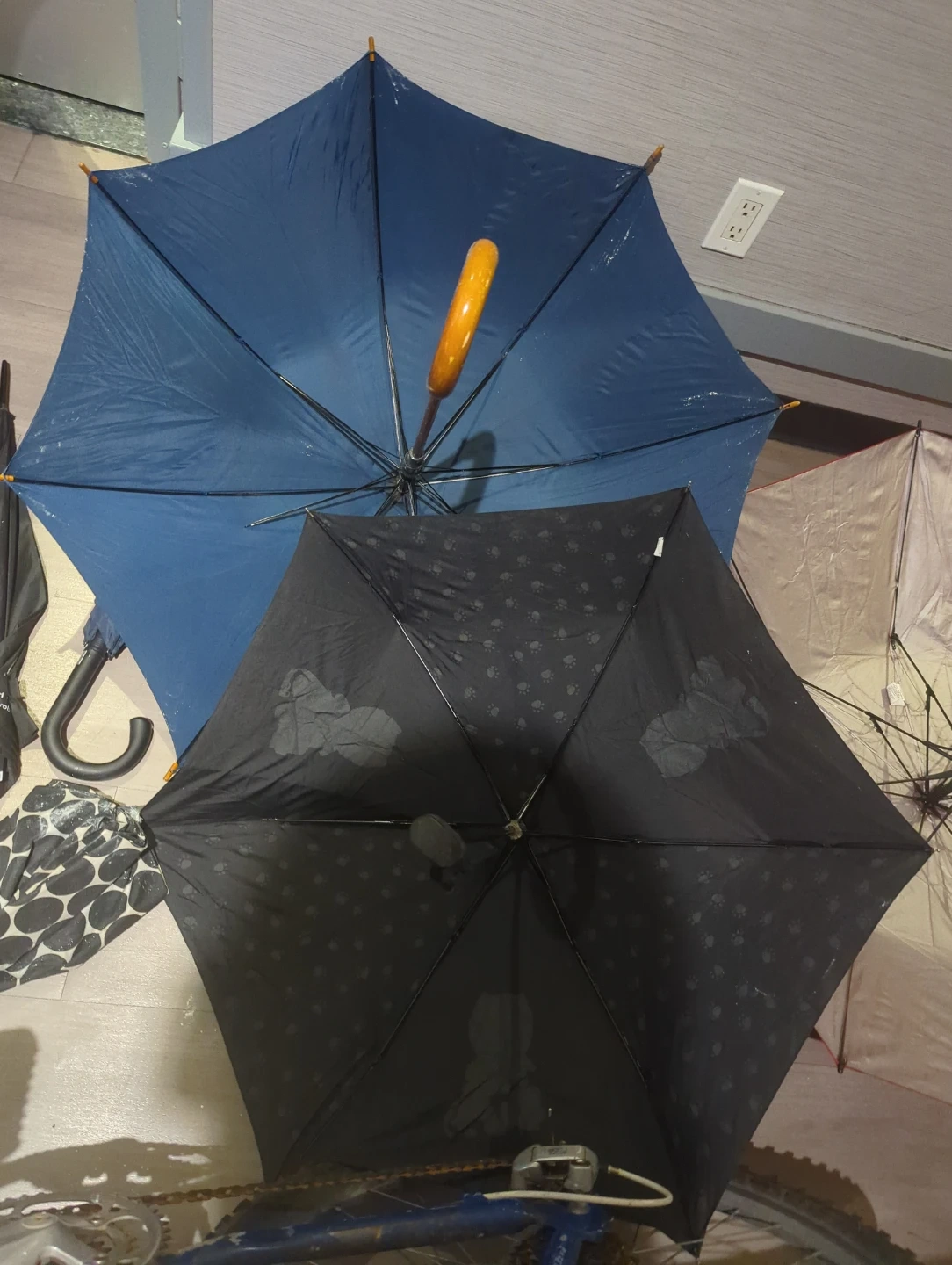 Bundle of umbrellas, including black, blue, and grey. Some feature patterned designs. They've got curved handles for a comfortable grip. Great for unexpected rainy days! 2 for 1 on certain umbrellas , pickup my pleasant / main st / downtown/ Skytrain , etc or get delivered with organic whole foods π π π π π fruit / bread π, etc