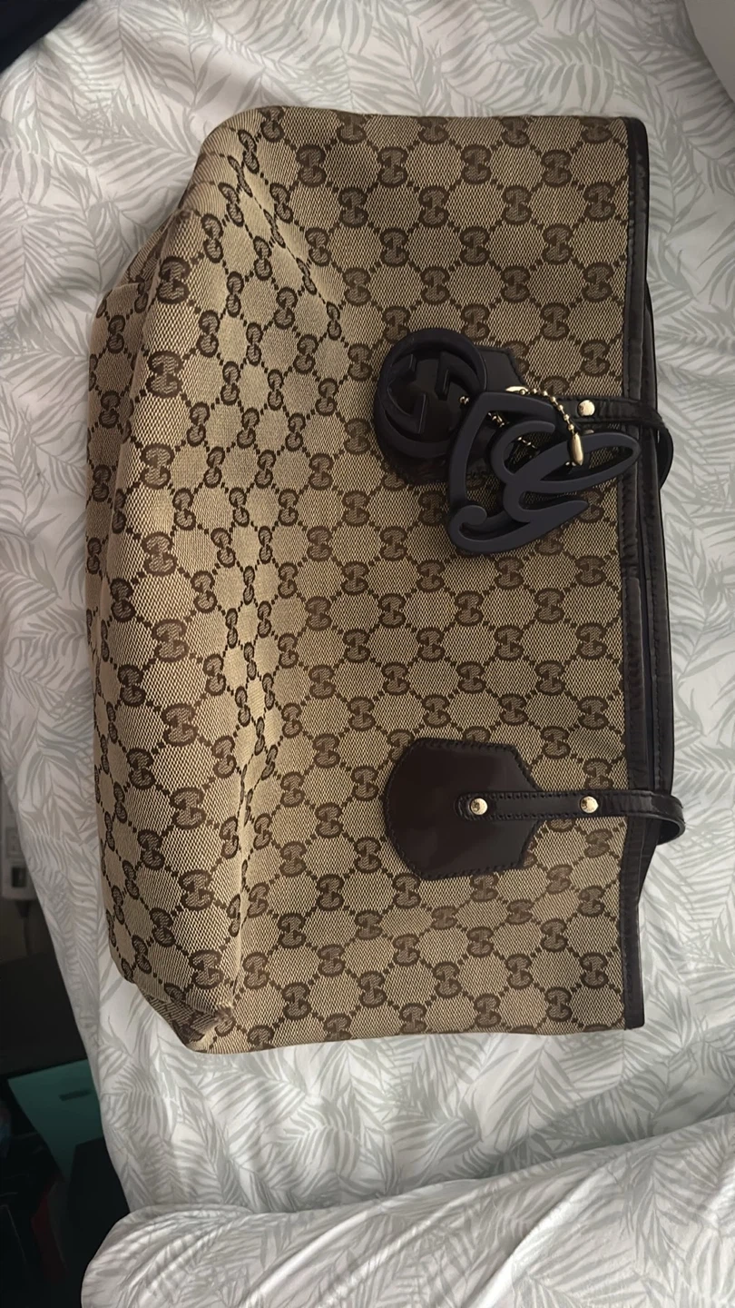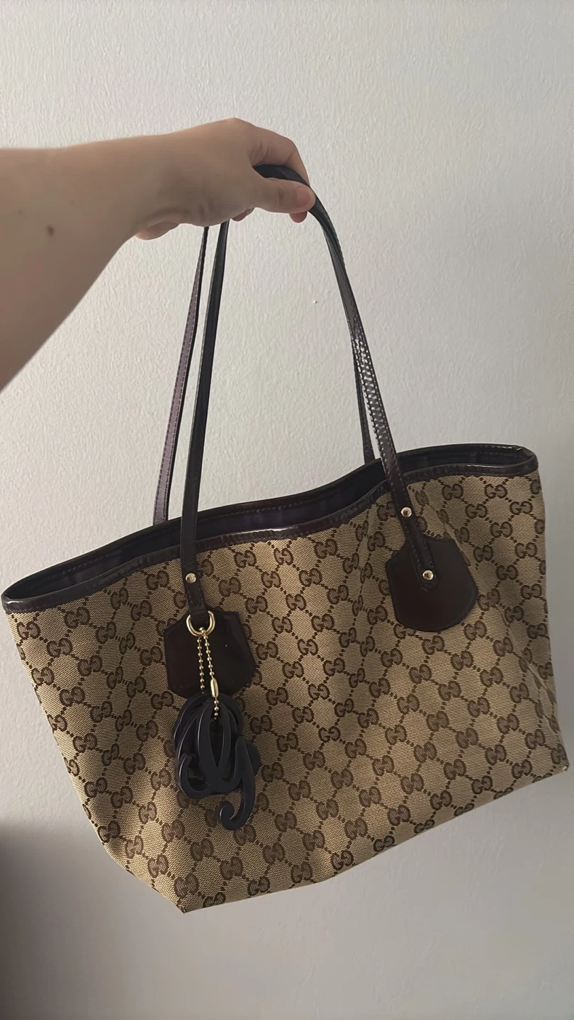 Classic Gucci GG monogram canvas tote bag with leather trim. It features double shoulder straps. This bag is perfect for everyday use, carrying your essentials in style.