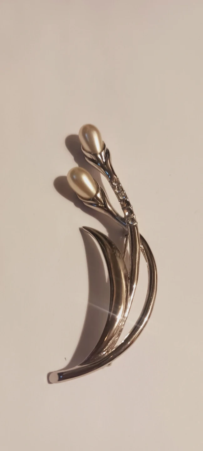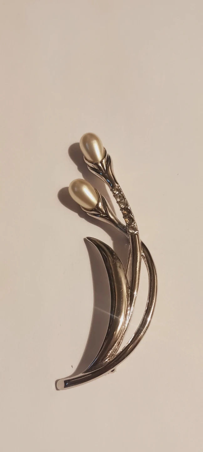 This beautiful brooch features a silver-tone metal design with two pearl accents and sparkling rhinestone details, shaped like a stylized flower with leaves. It's a lovely accessory for any outfit!!! 3.5"×1". Excellent condition, like new. ALL MY PRICES ARE NEGOTIABLE !!