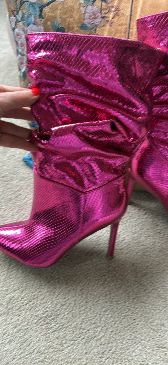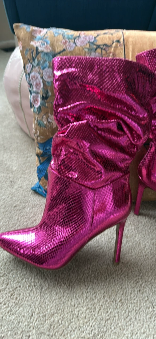 These stylish heeled booties feature a vibrant pink metallic finish with a snake print texture. They have a pointed toe and a comfortable slouchy shaft. Size 9.