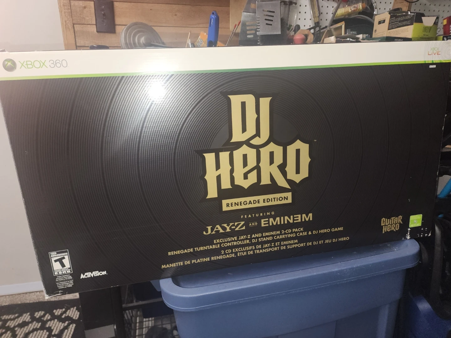 This bundle includes the DJ Hero Renegade Edition game for Xbox 360. It features an exclusive Jay-Z and Eminem 2-CD pack, a renegade turntable controller, and a DJ stand carrying case. It's compatible with Xbox Live.