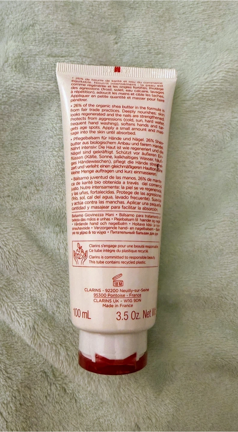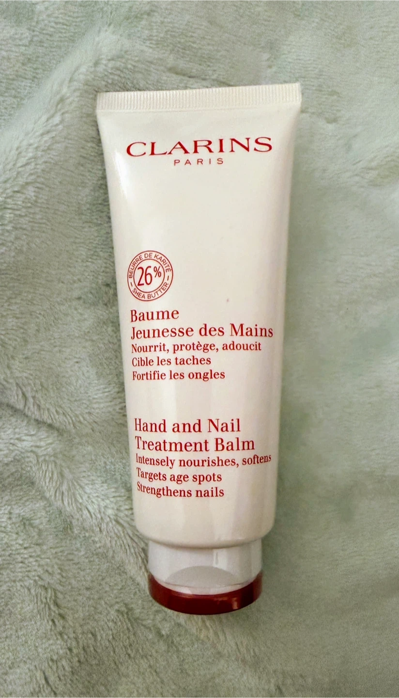 Clarins Hand and Nail Treatment Balm deeply nourishes and softens hands. It targets age spots and strengthens nails. 26% organic shea butter from fair trade practices. 100 ml (3.5 oz) Net Wt.