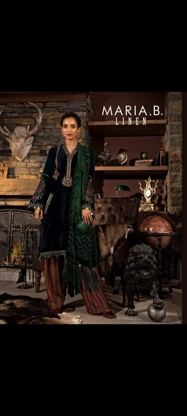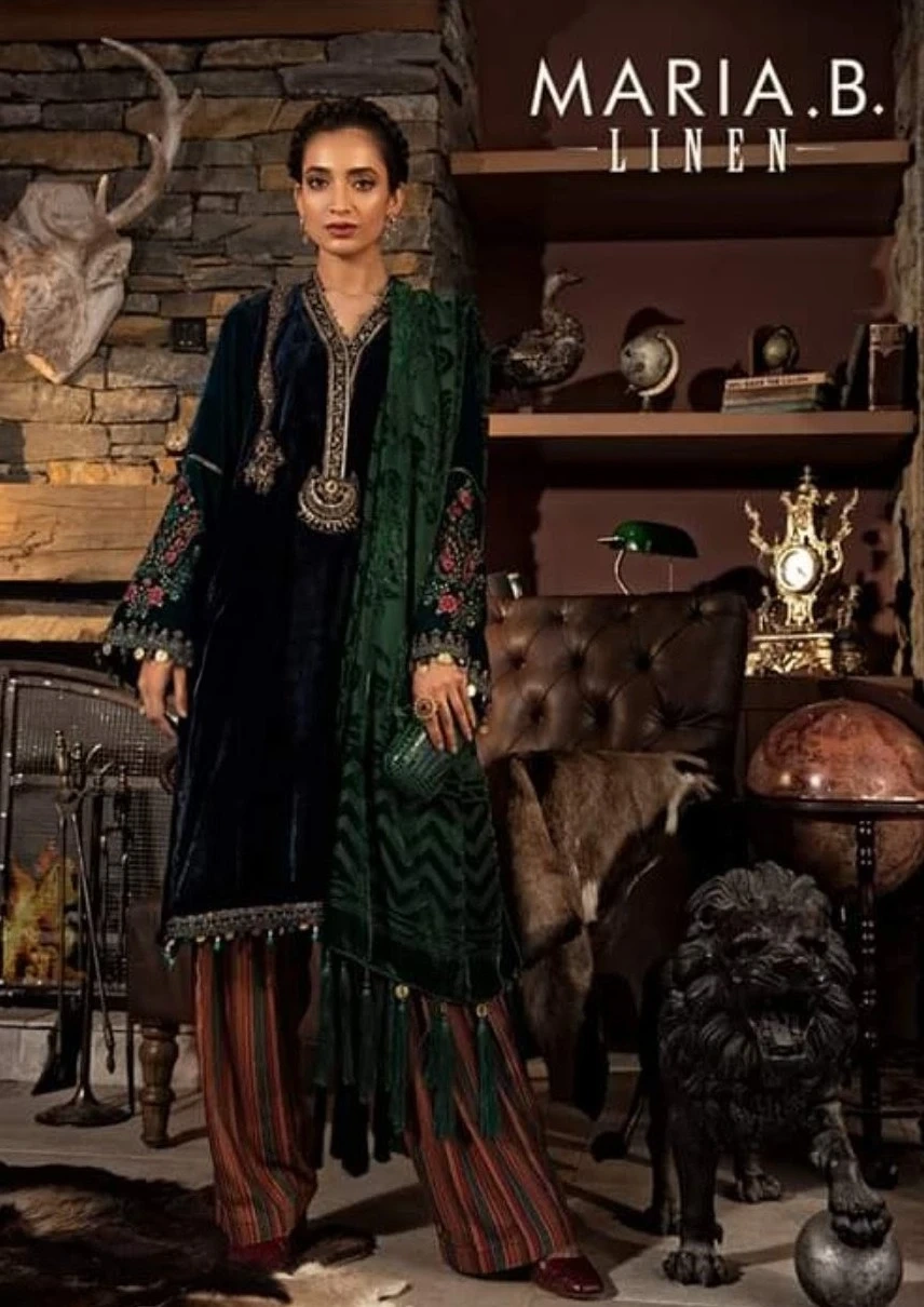 Beautiful dark velvet dress with intricate embroidery on sleeves and neckline. Comes with a matching emerald green shawl and striped shalwar. This outfit is perfect for formal occasions and festive gatherings.