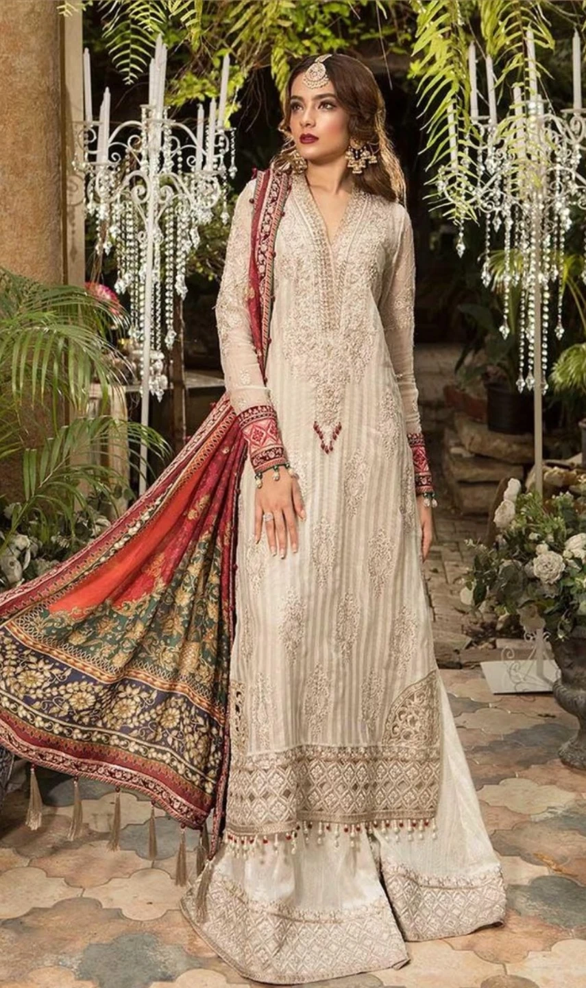 This elegant suit features intricate embroidery on the neckline and sleeves. It comes with a beautifully printed dupatta. The material is lightweight and breathable, perfect for warmer weather.