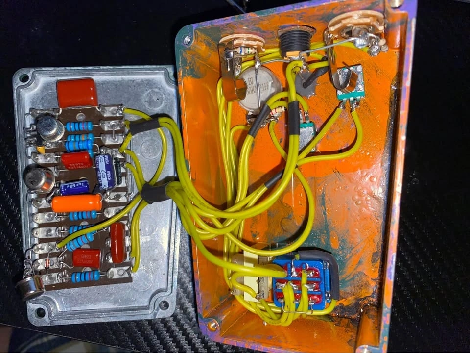 Freshly built Tone Bender MK4, made to vintage specs. Built with a trio of AC128s with an audio transformer added to keep the impedance true throughout your pedalboard without signal drop or fading. Custom hydro-dip paint job.