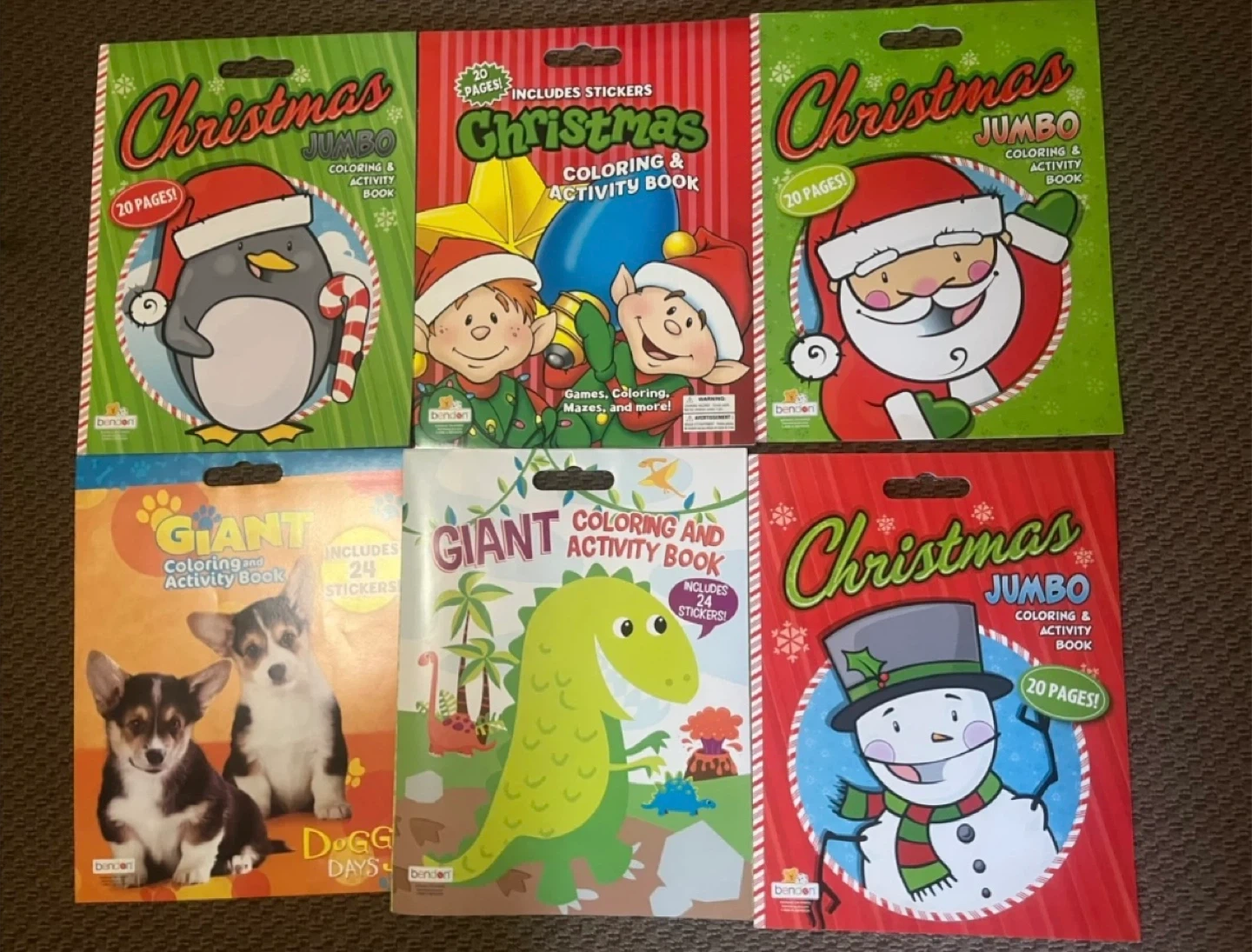 Pack of 6 coloring and activity books, perfect for keeping little ones busy! These books include colouring pages, games, mazes, and stickers. They're great for holiday fun or just a rainy day activity.