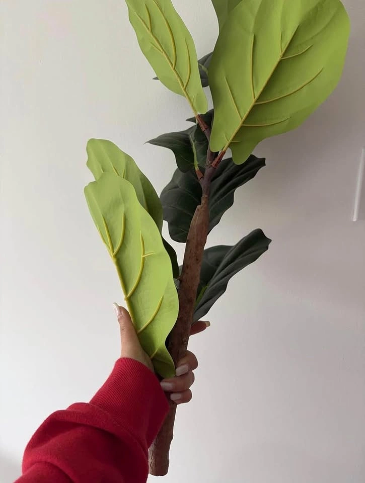 Artificial fiddle leaf fig tree with white planter. The 3 trunks of the ficus tree are made of natural wood poles, giving it a lifelike appearance with realistic texture and look. Pick up near Salem and Taunton.
