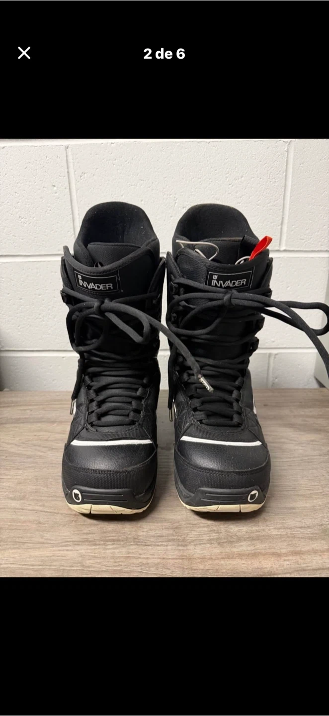 Black Burton Invader snowboard boots. Men's US size 9. Durable construction for riding. These boots offer a secure fit for your snowboard adventures!