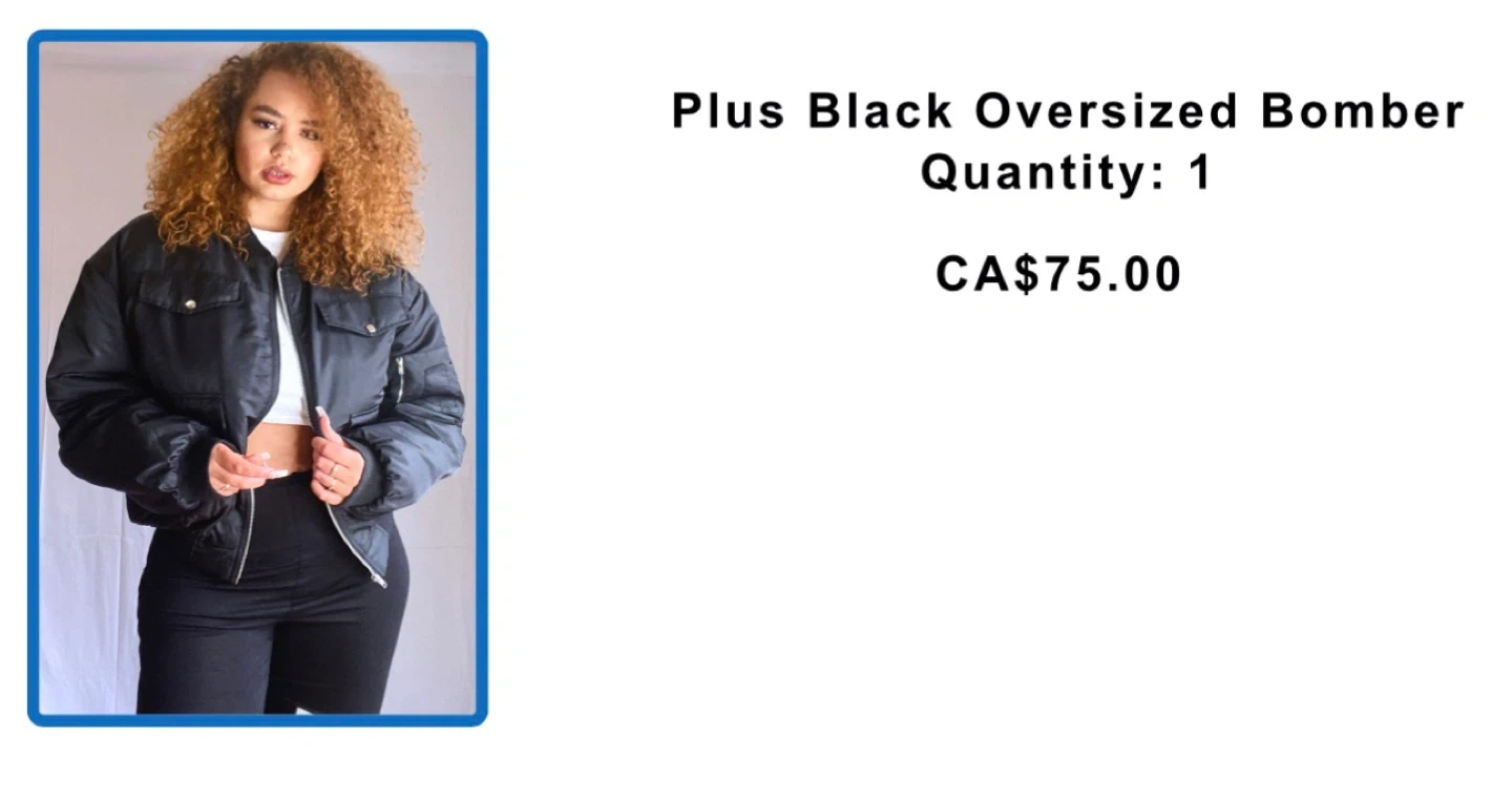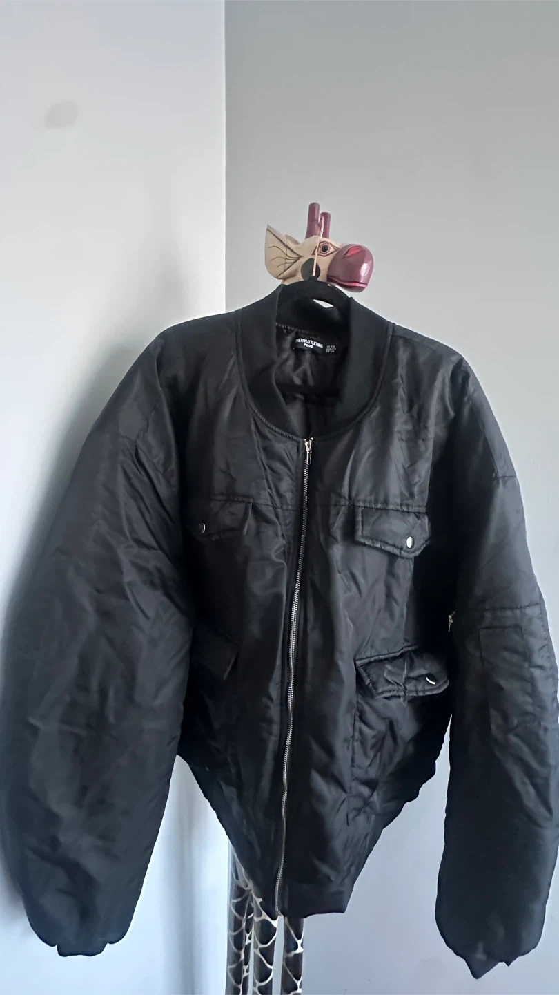 This black oversized bomber jacket is from PrettyLittleThing Plus. It's a size EU 56 / UK 28 / USA 24. It has a zip-up front and two faux chest pockets and two button up pockets and one small zipper slot on the arm.