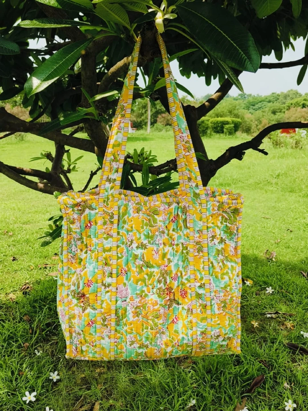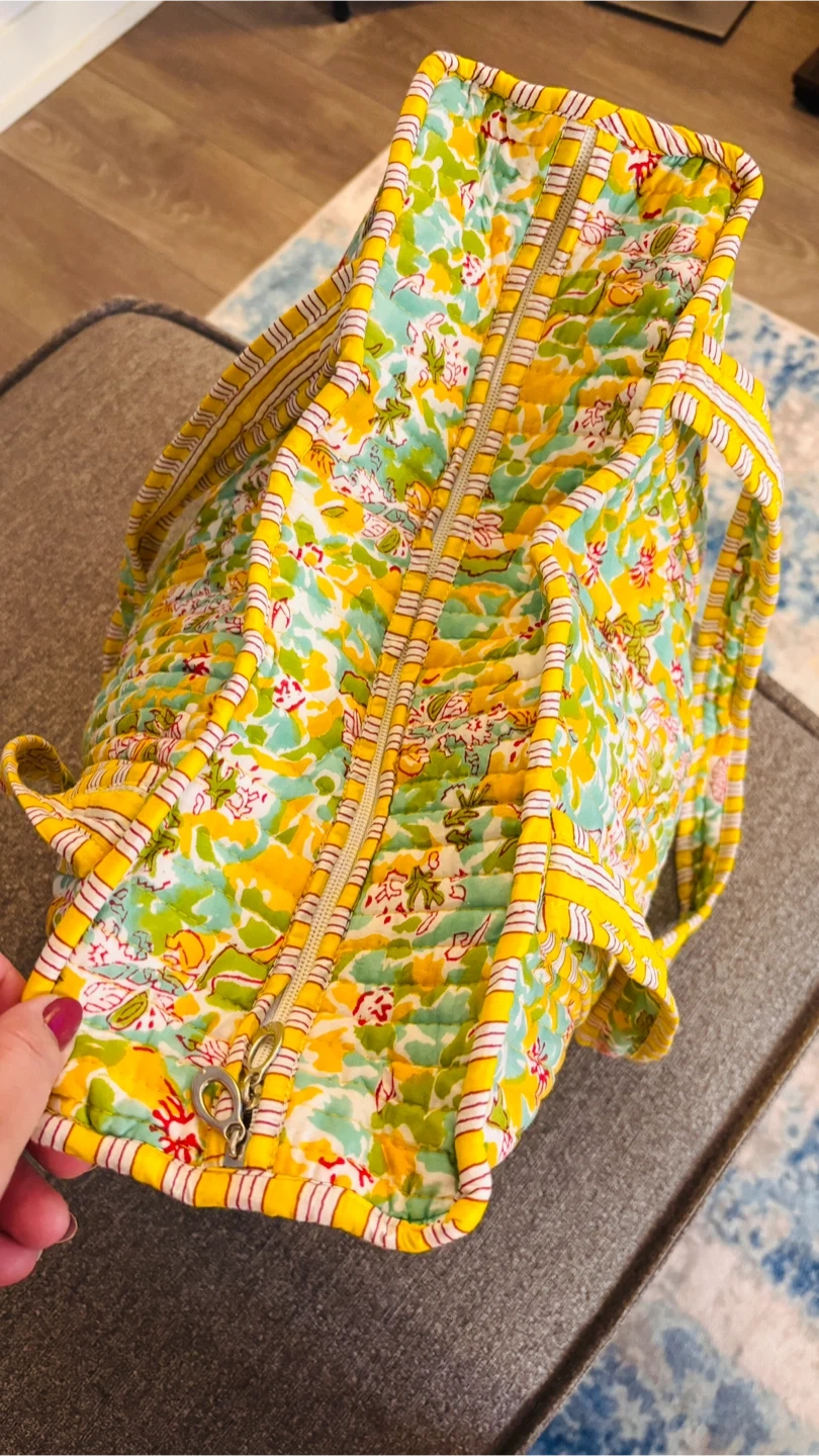 Quilted tote bag featuring a playful strawberry print and many more vibrant colours. It's perfect for carrying your essentials. Fabric material. 100 cotton , very soft to touch with inner pocket and zipper closure.