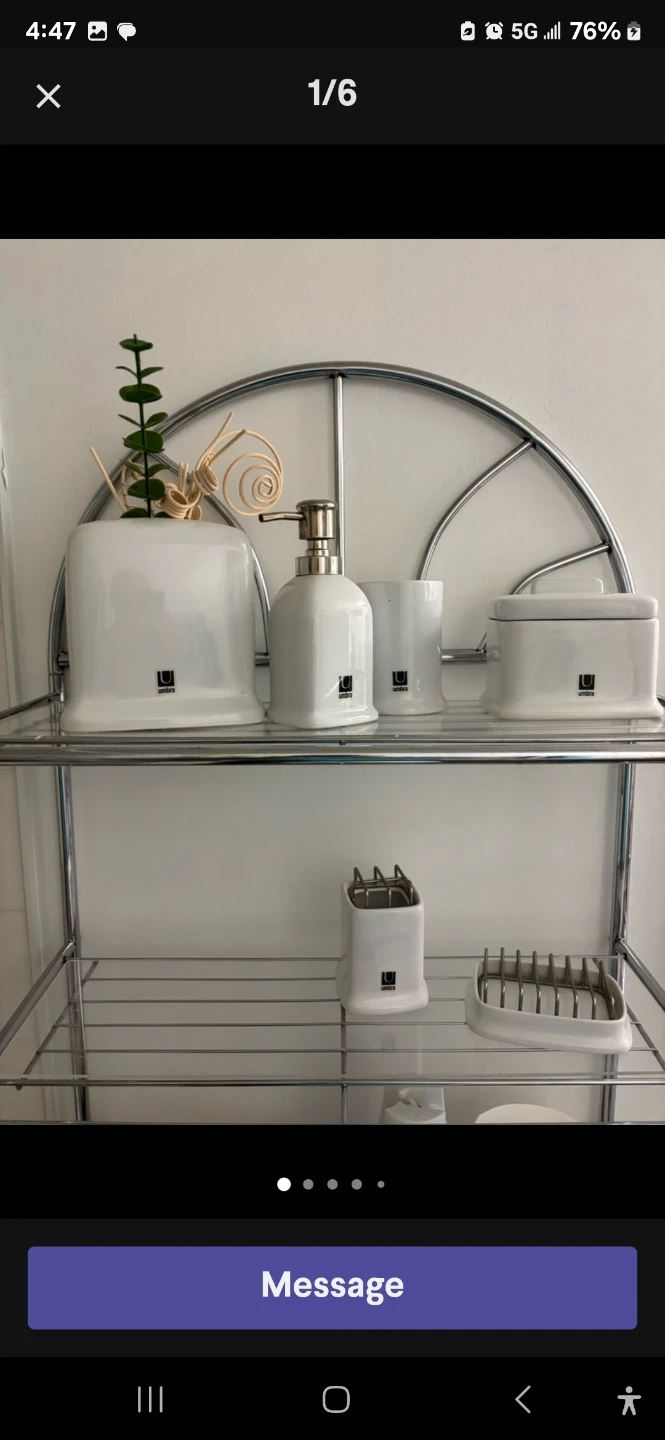 This set includes a soap dispenser, toothbrush holder, soap dish, covered container, and a decorative piece. All items are white ceramic with the Umbra logo. They're in good condition.