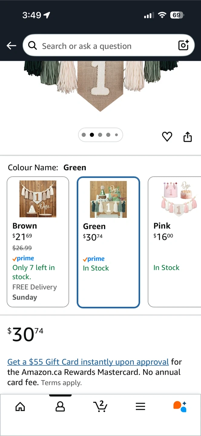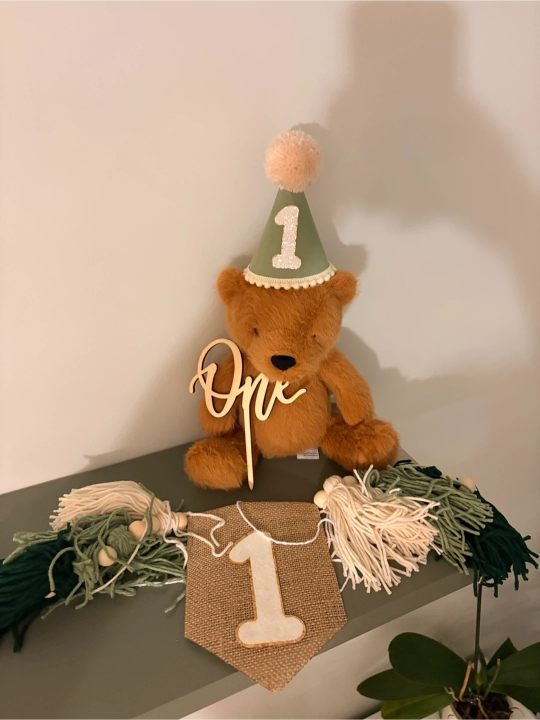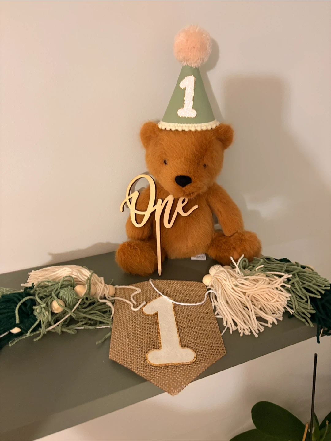 This set includes a green high chair banner and a 'One' cake topper. The banner is made of burlap with green and cream tassels. It's in perfect condition, zero wear. Bought from Amazon for $30 plus tax.