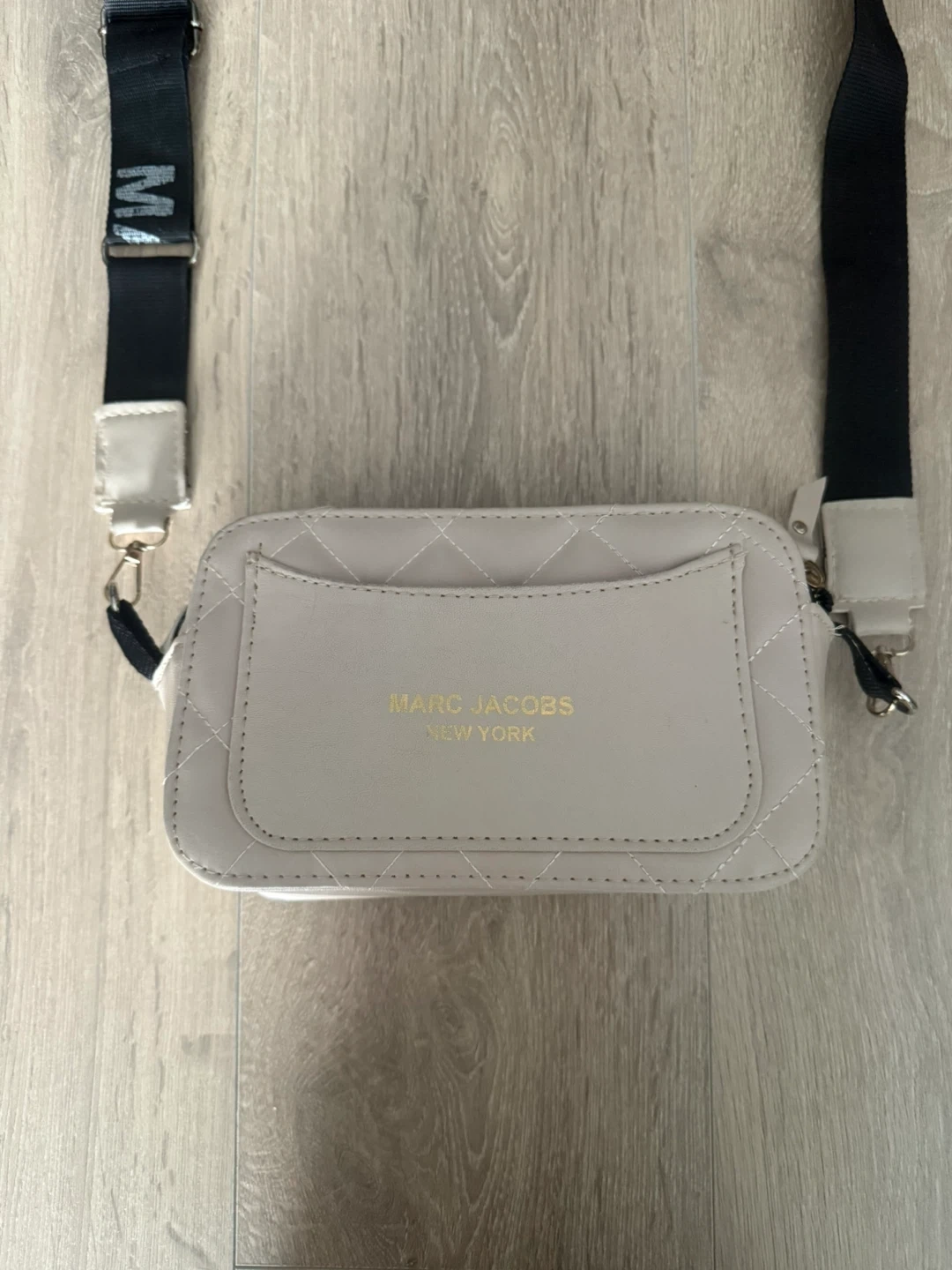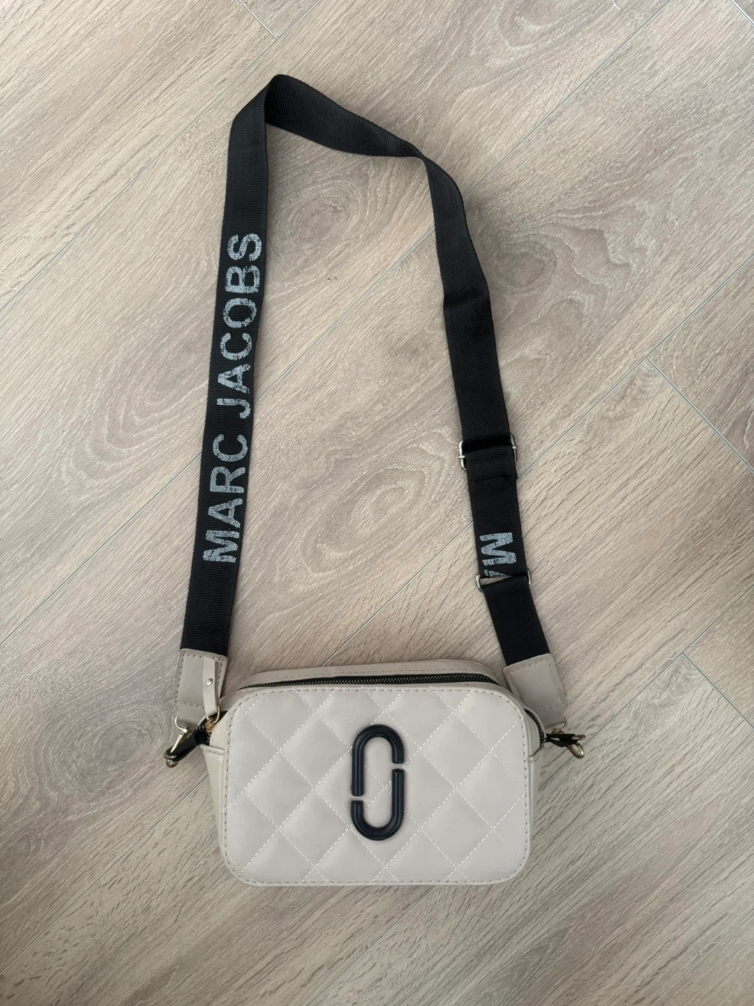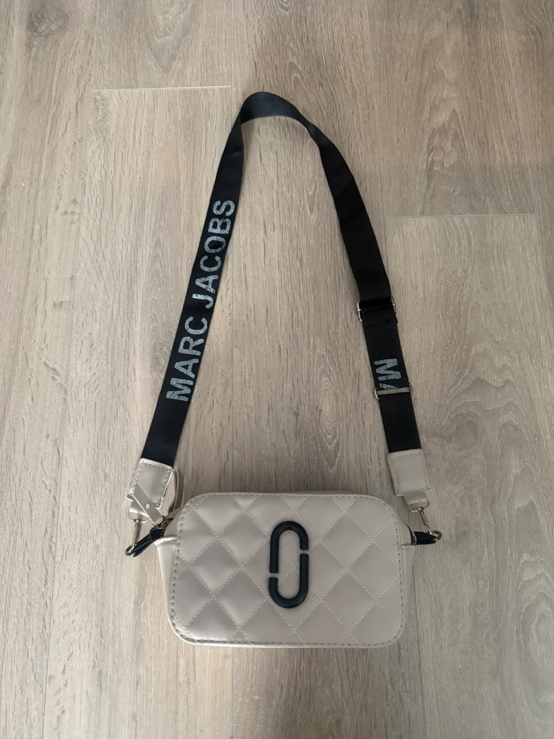 This is a beige Marc Jacobs The Snapshot Bag. It features a quilted design and a black strap with the brand name printed on it. The bag has a front pocket and a main zippered compartment. The retail price goes around 430-460 CAD so i kept the price reasonable since its worn before. Im open for reasonable offers.