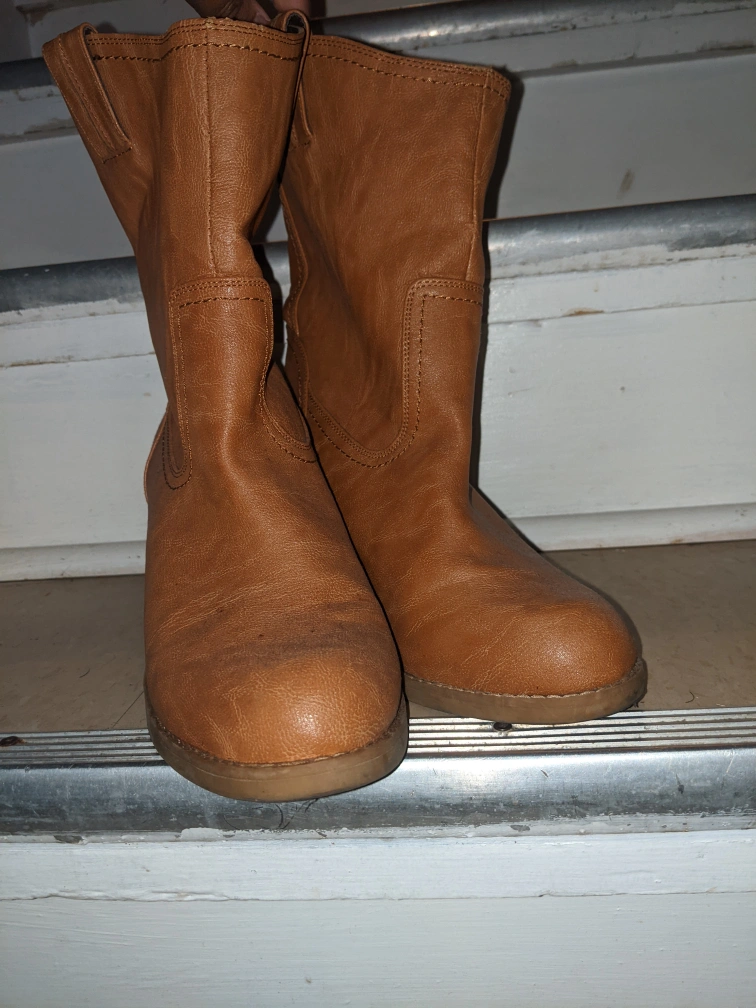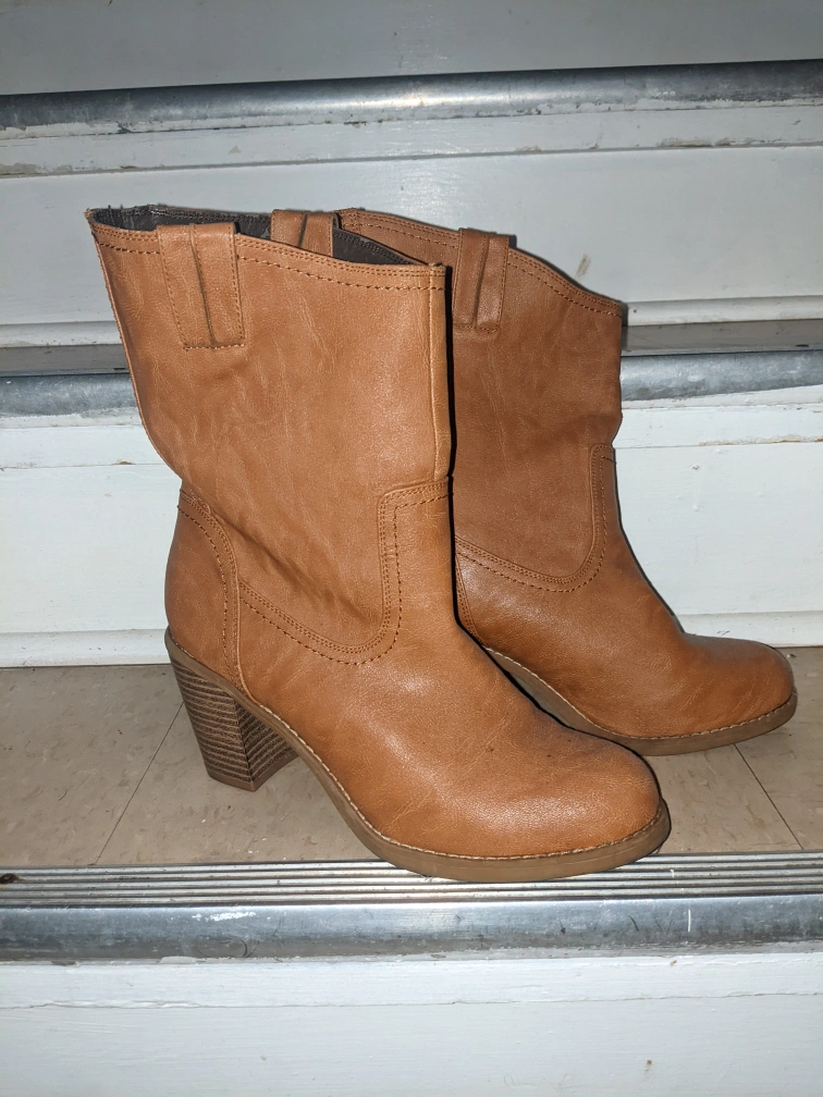 Biscuit color brown calf length faux leather cowboy style heeled boots. About a 3 inch chunky heel. Only worn a few times. Inside leather is a bit worn.