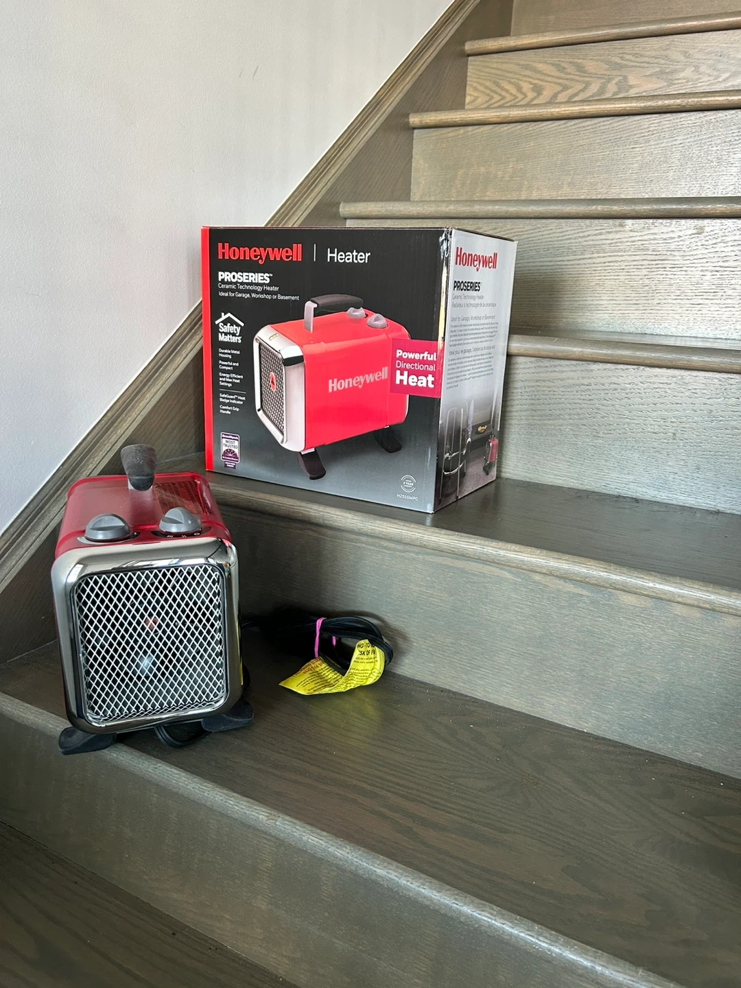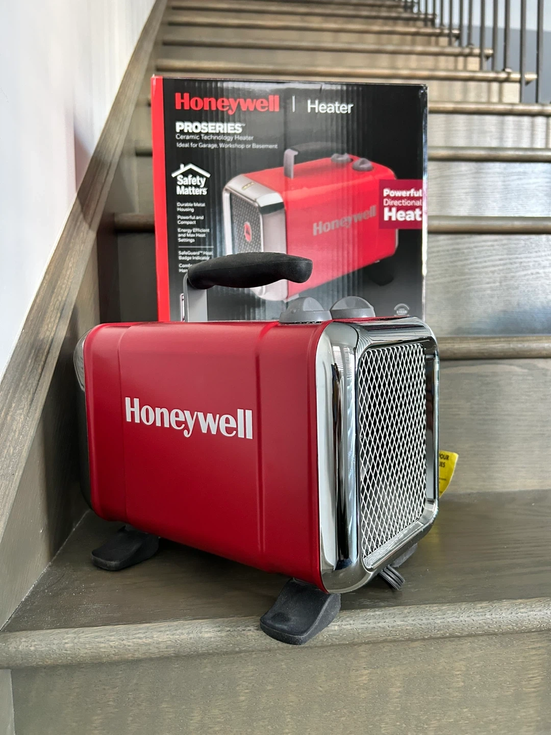 Honeywell ProSeries portable heater. It's powerful and designed for directional heat. Ideal for garages, workshops, or basements. Durable metal housing and safety features included.