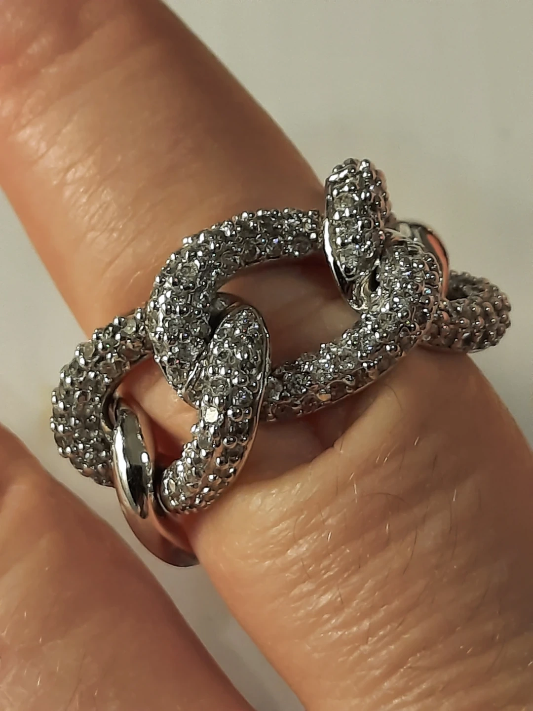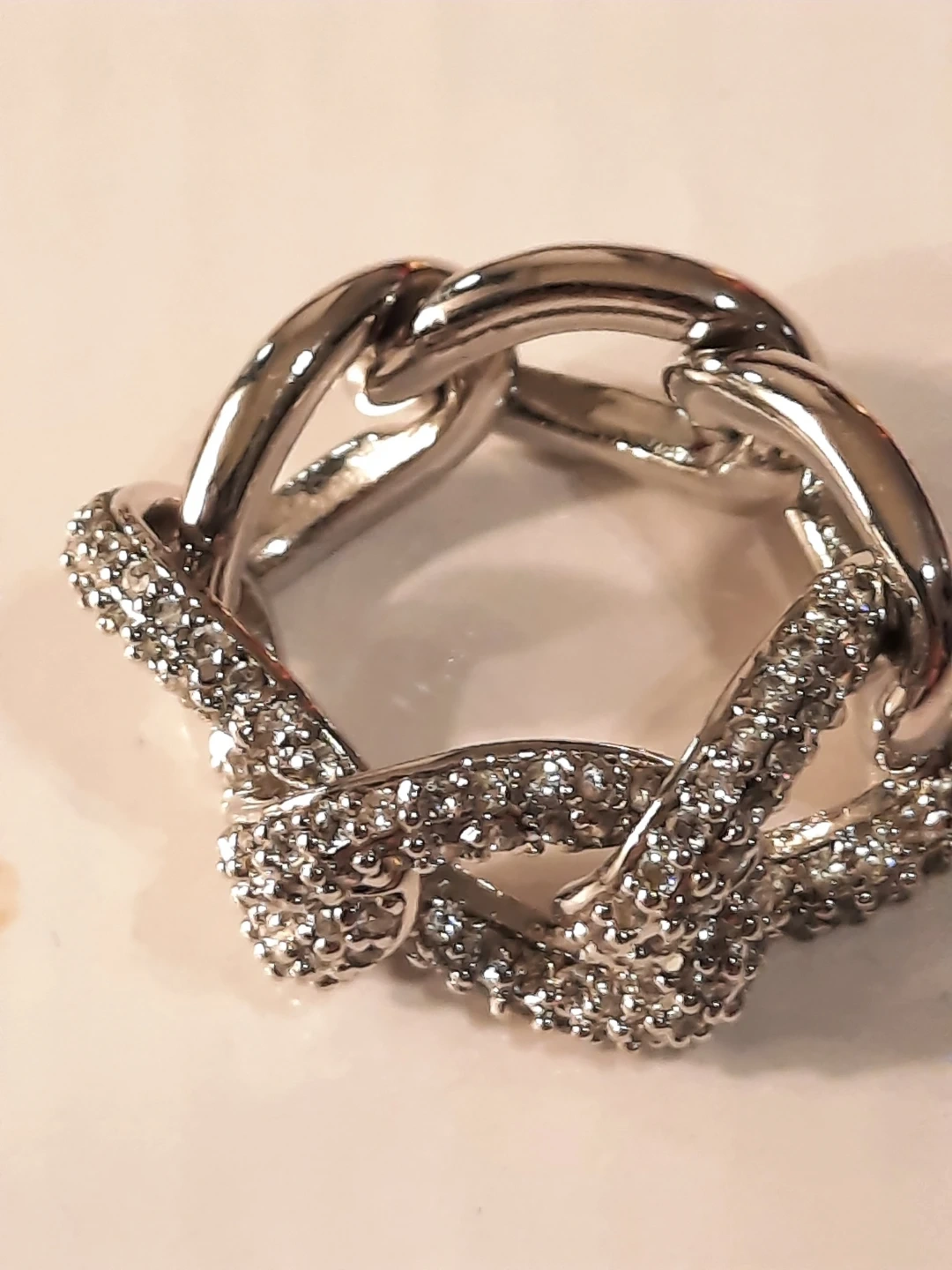 This ring features a bold, chunky link design. One side is accented with sparkling stones for extra flair. It's a statement piece that catches the light beautifully.