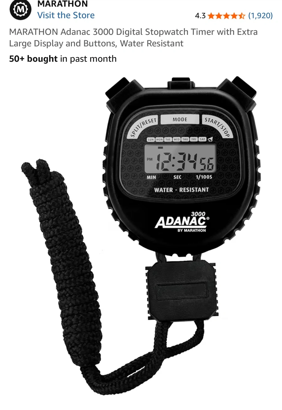 This is a MARATHON Adanac 3000 digital stopwatch. It's water resistant and has a large display with extra buttons. The stopwatch can measure time to 1/100s.
