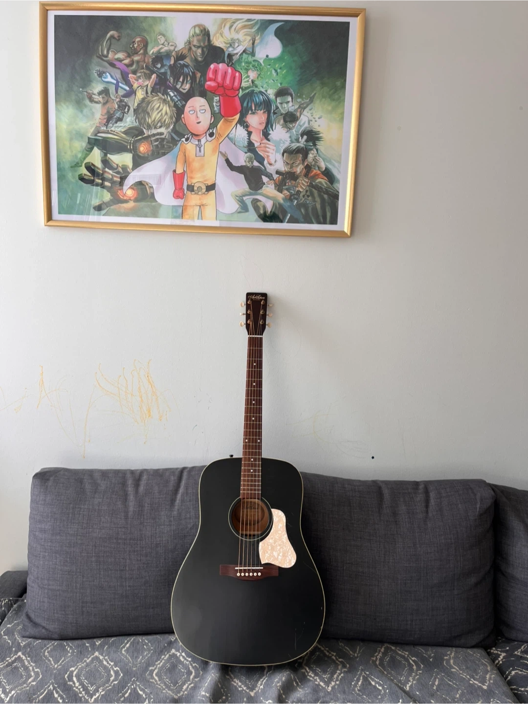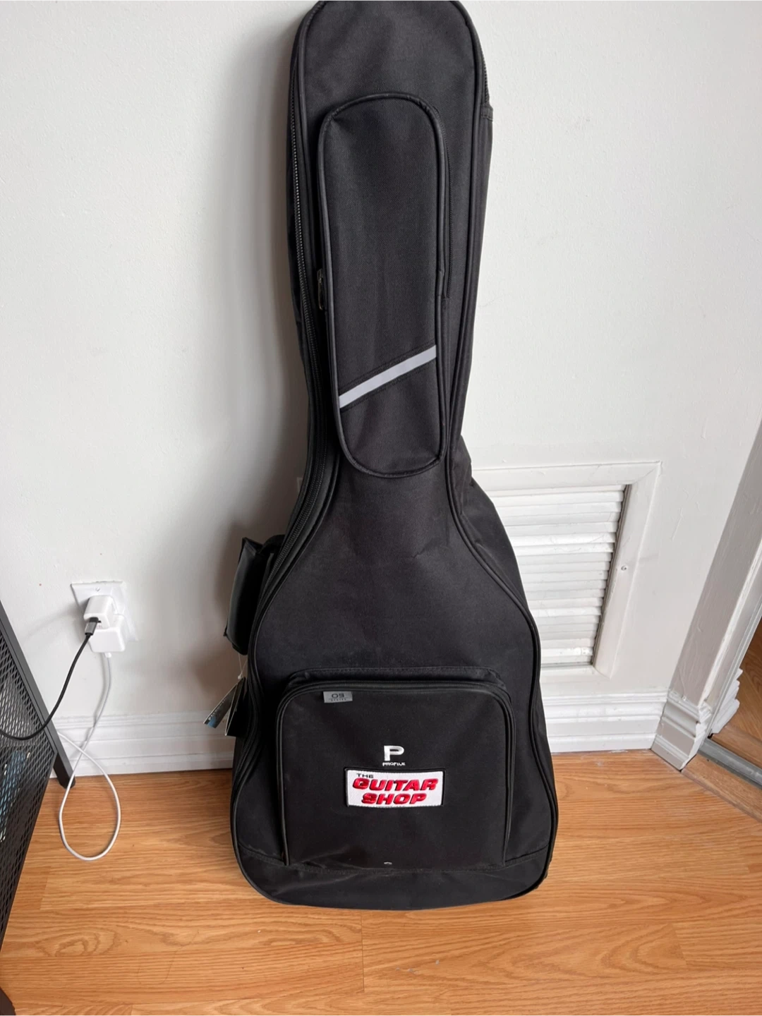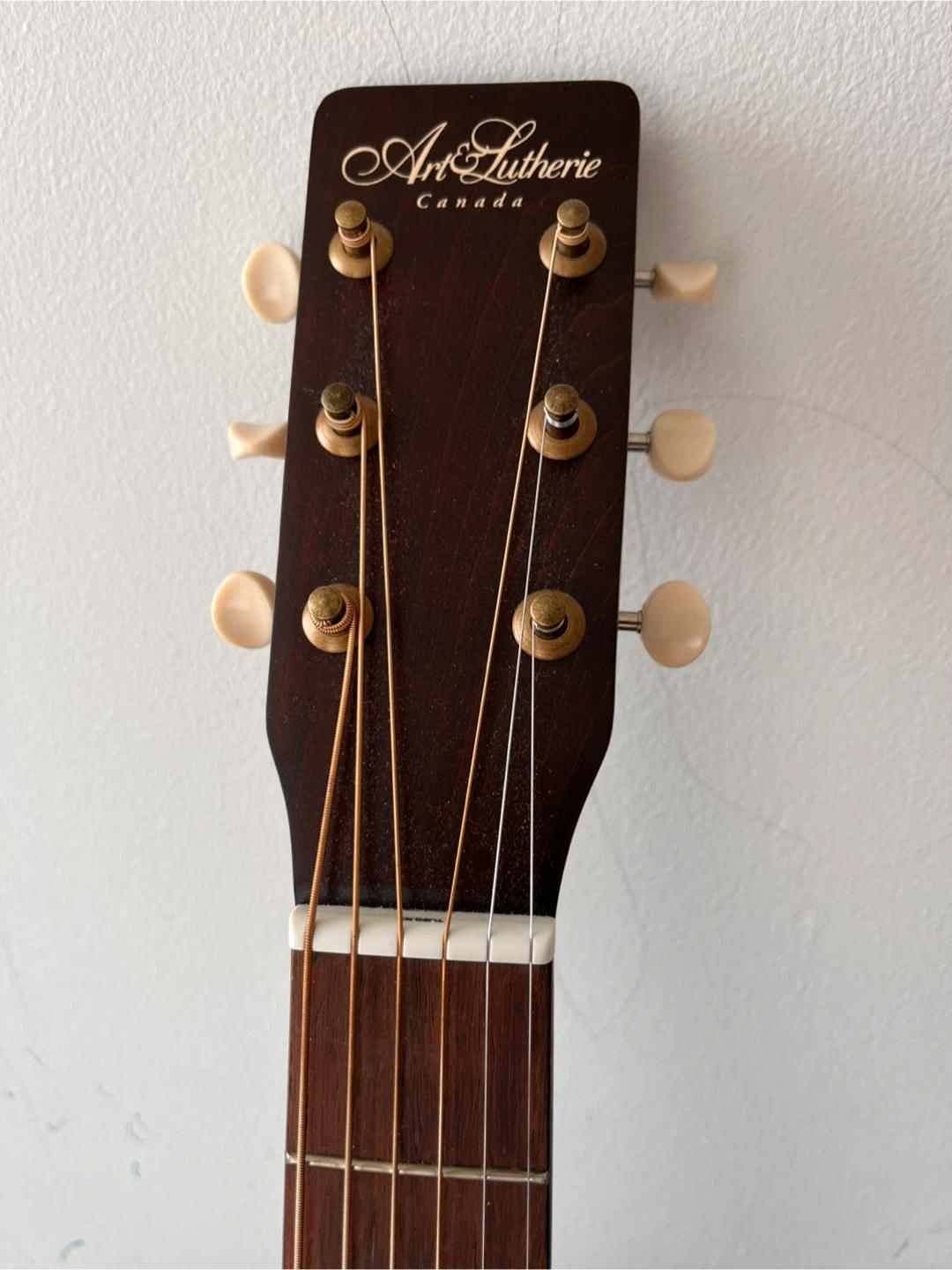 This is an Art & Lutherie acoustic guitar, It's black with a cream pick-guard and made of Canadian wood. Includes a gig bag for protection.