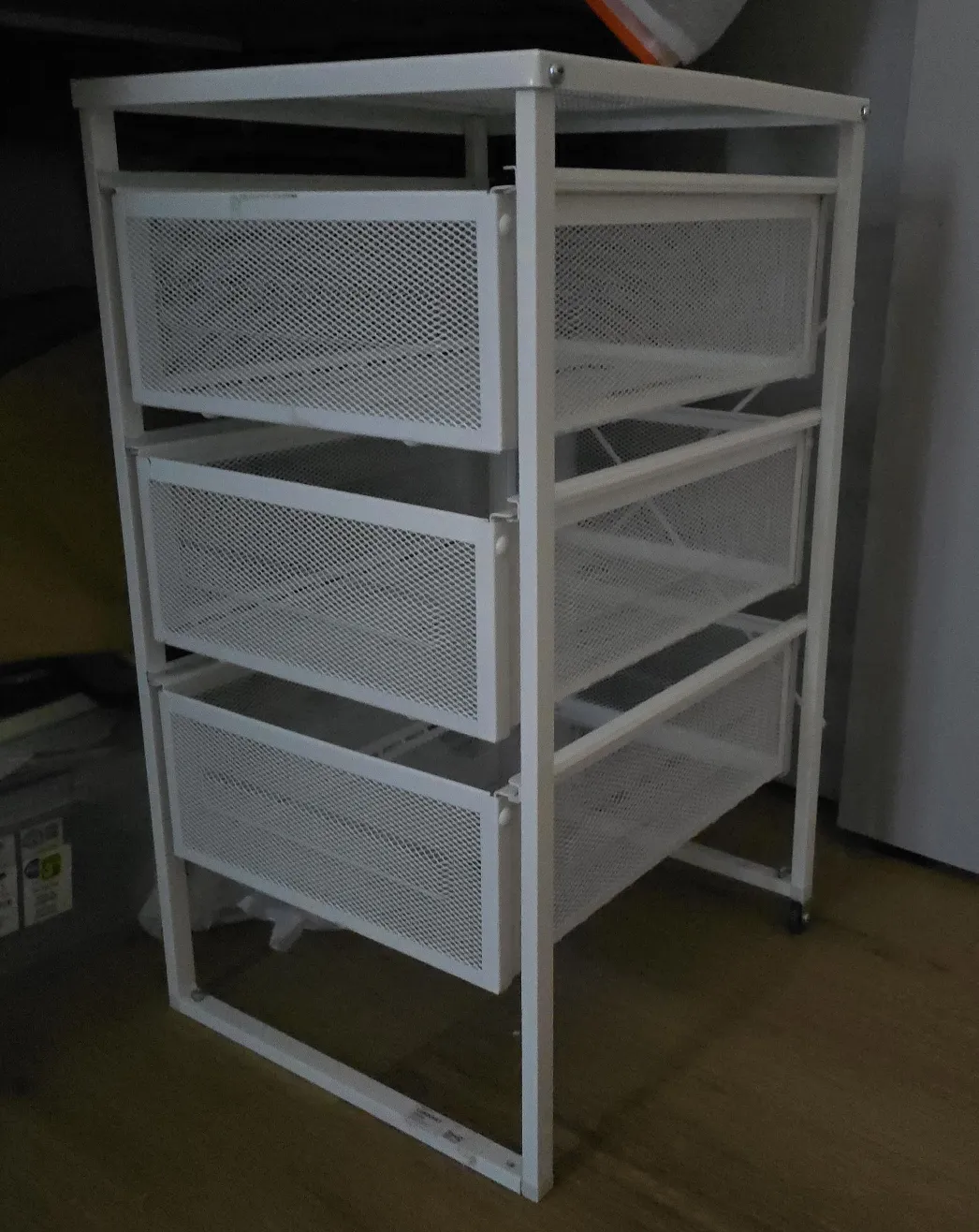 This is a white metal storage cart with three mesh drawers. It's on wheels for easy movement. Perfect for organizing small spaces in your home or office!