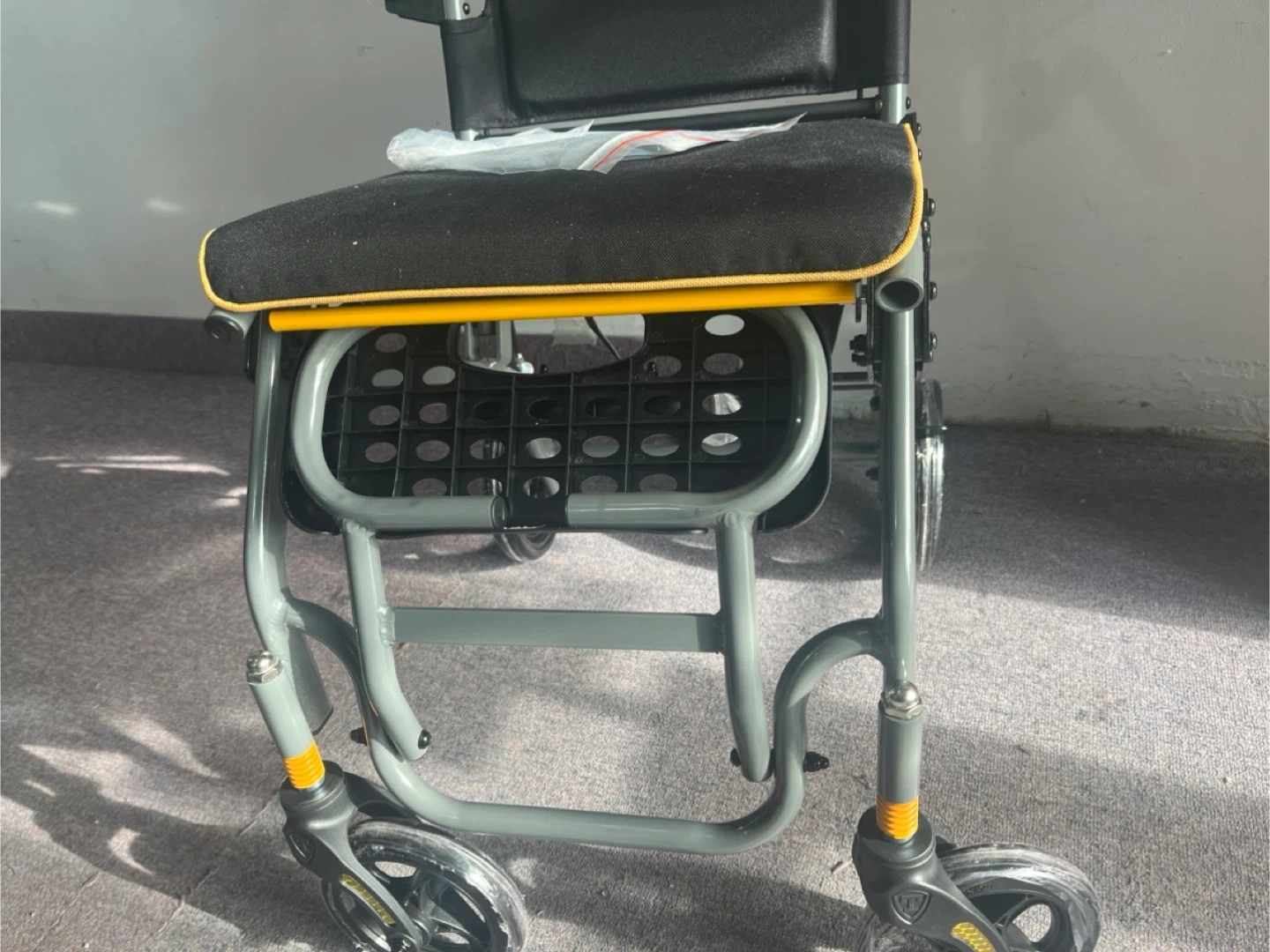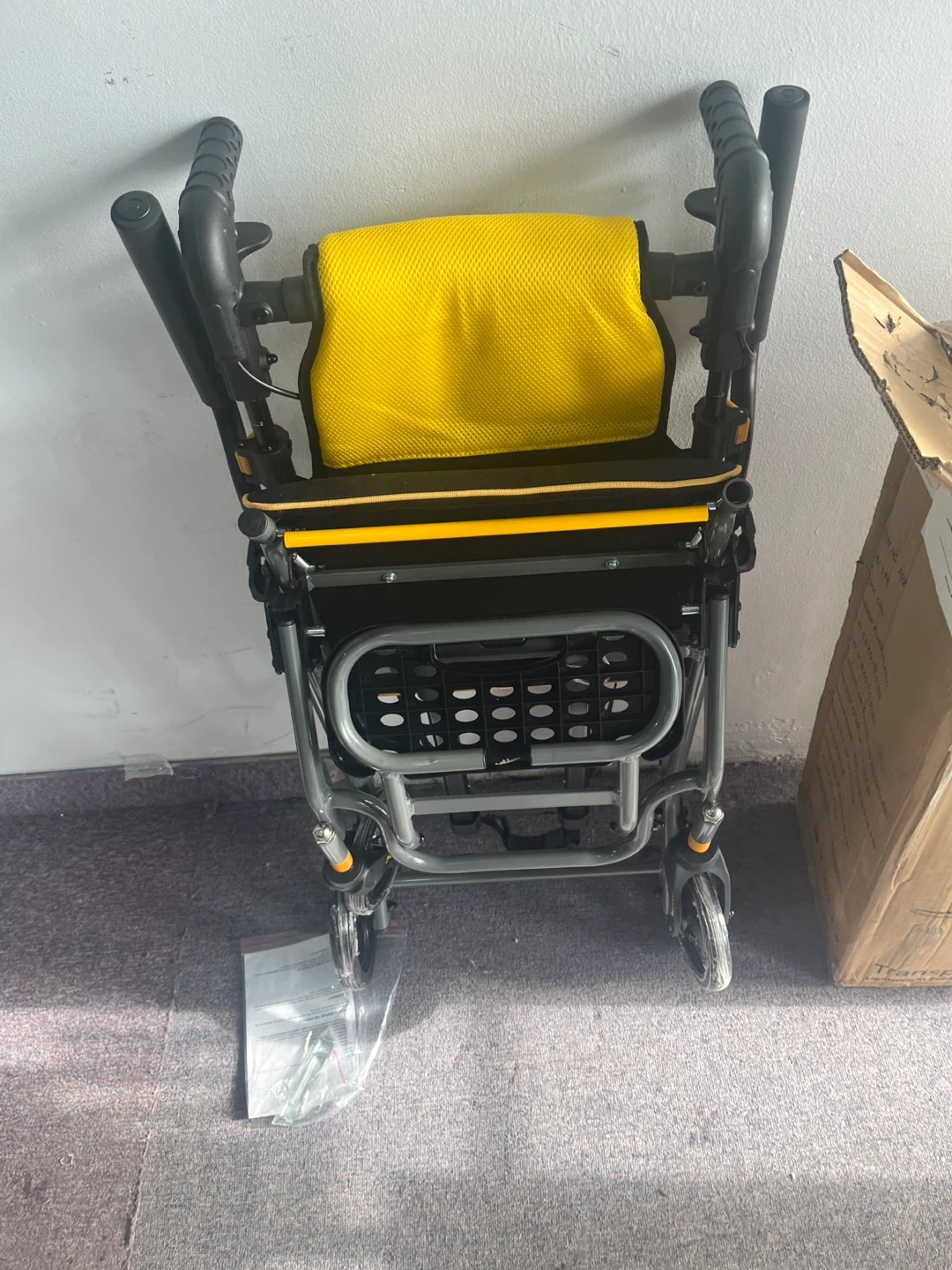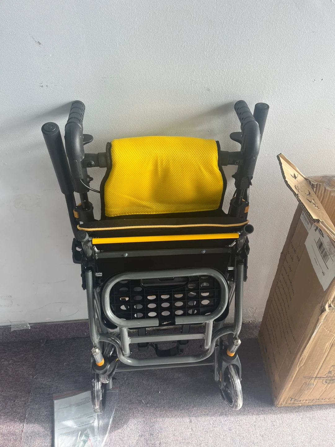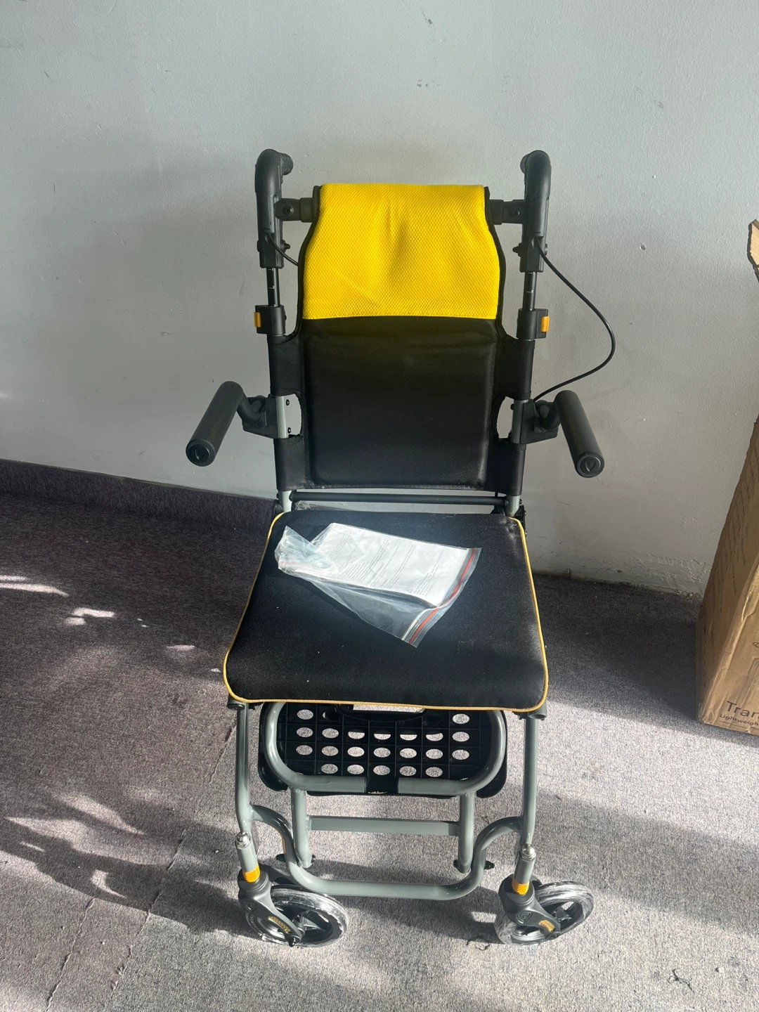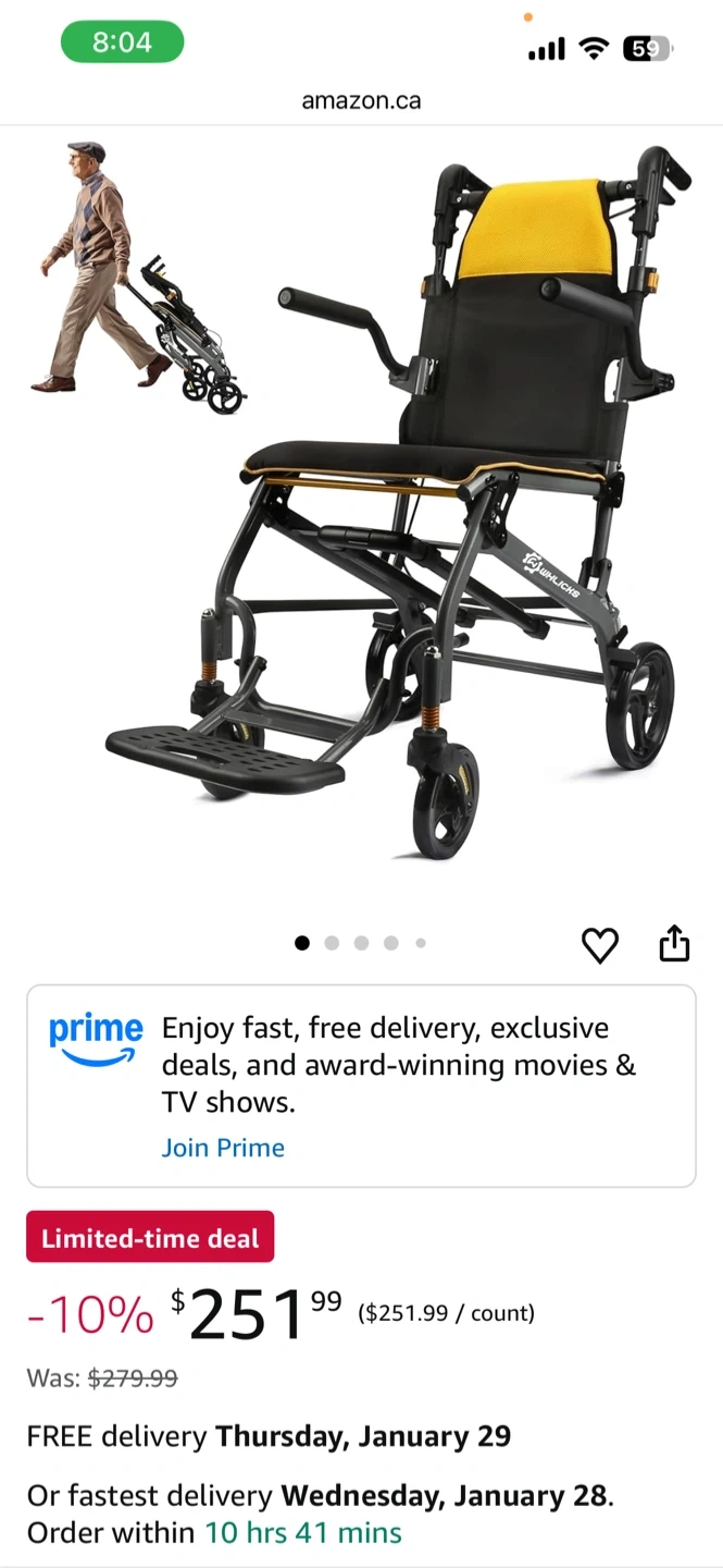 This is a lightweight folding wheelchair with a yellow padded backrest and black seat. It includes armrests and a footrest. The wheelchair is designed for easy transport and storage. It's great for individuals who need mobility assistance for appointments or outings. Actual price is $250 plus taxes on amazon.