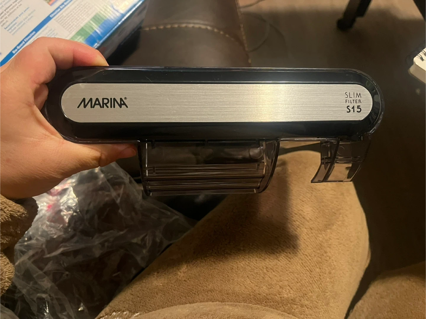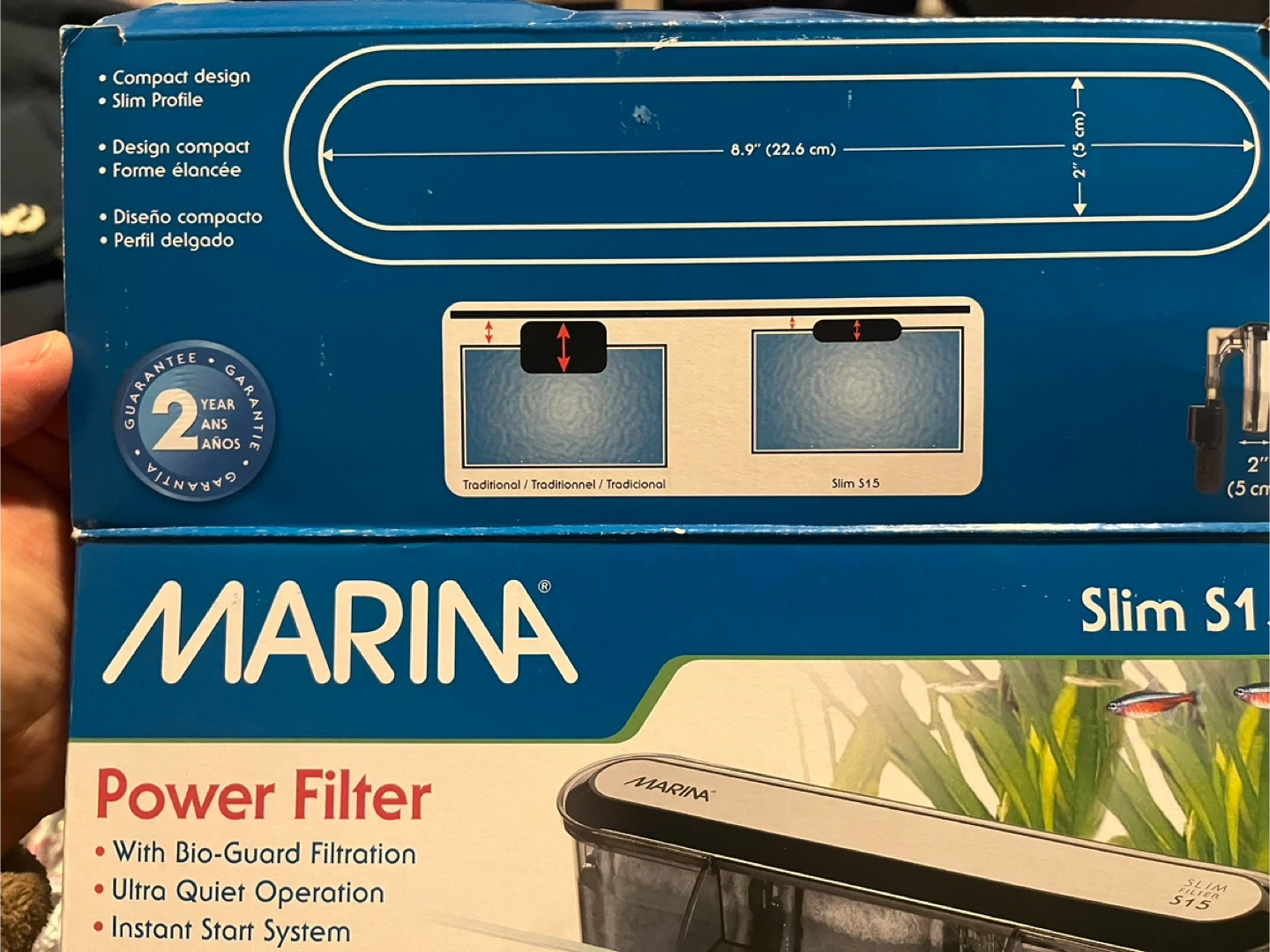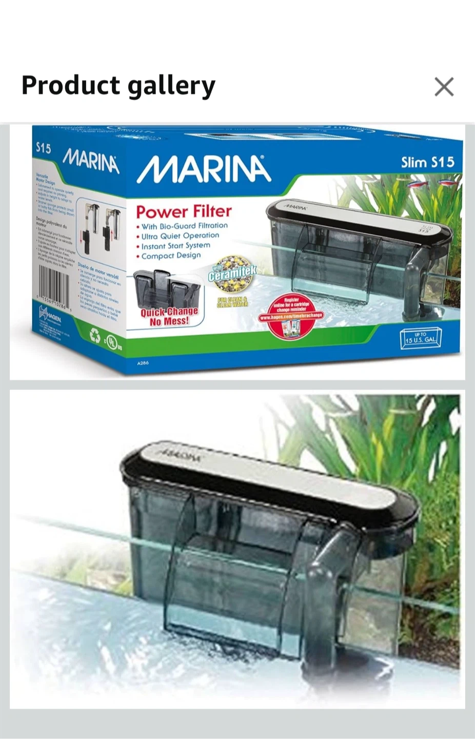 Marina S15 power filter for aquariums. It features bio-guard filtration, ultra quiet operation, and a compact design. Includes original box and filter cartridges.