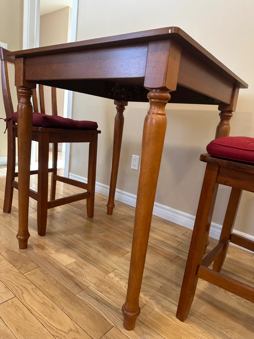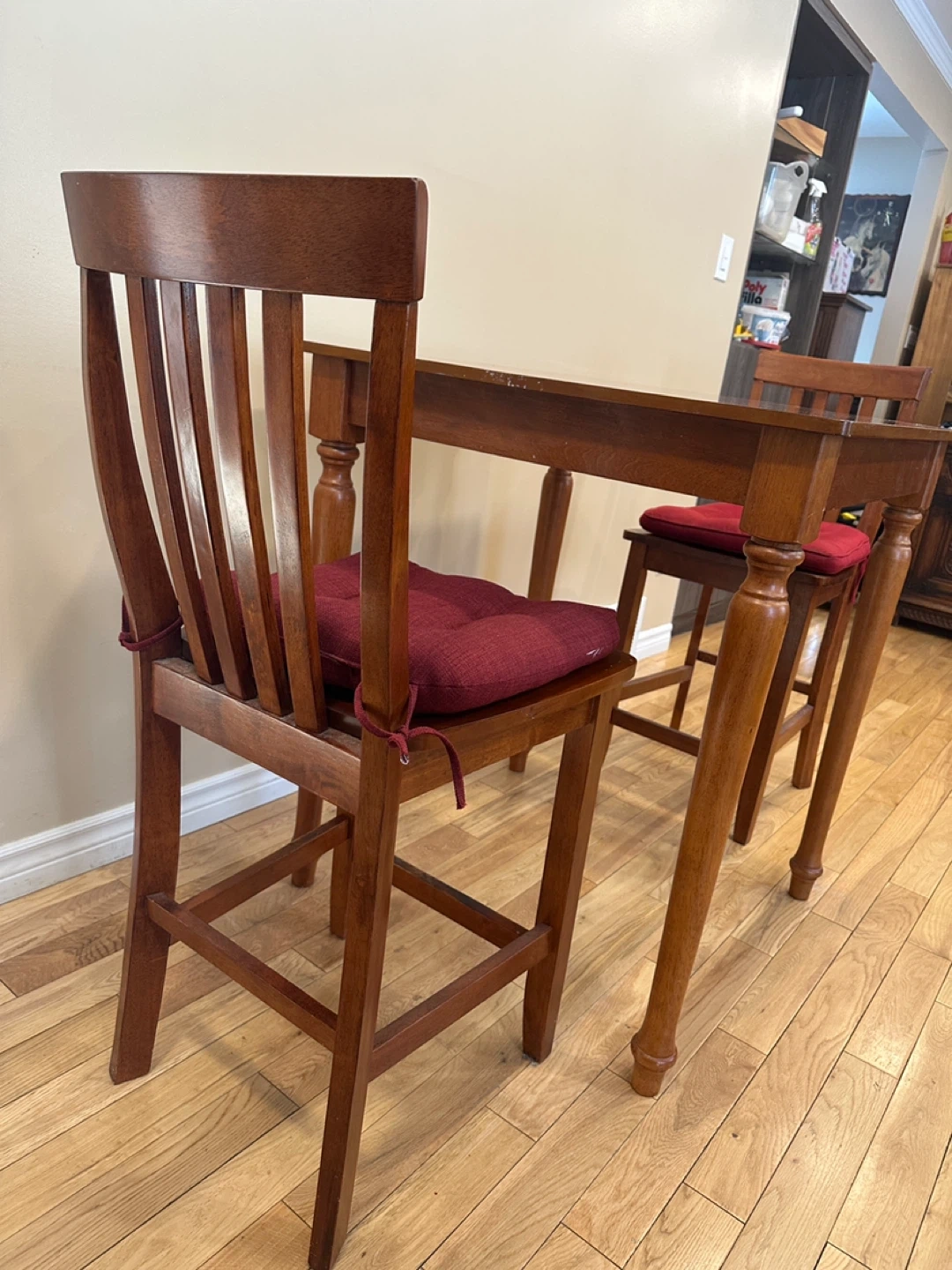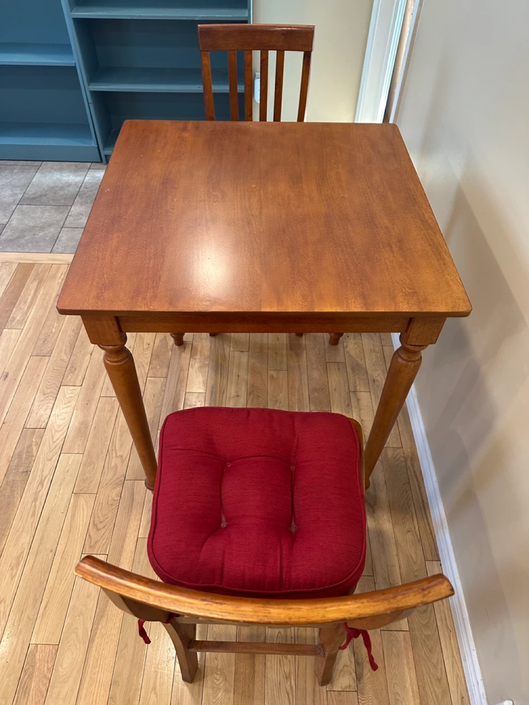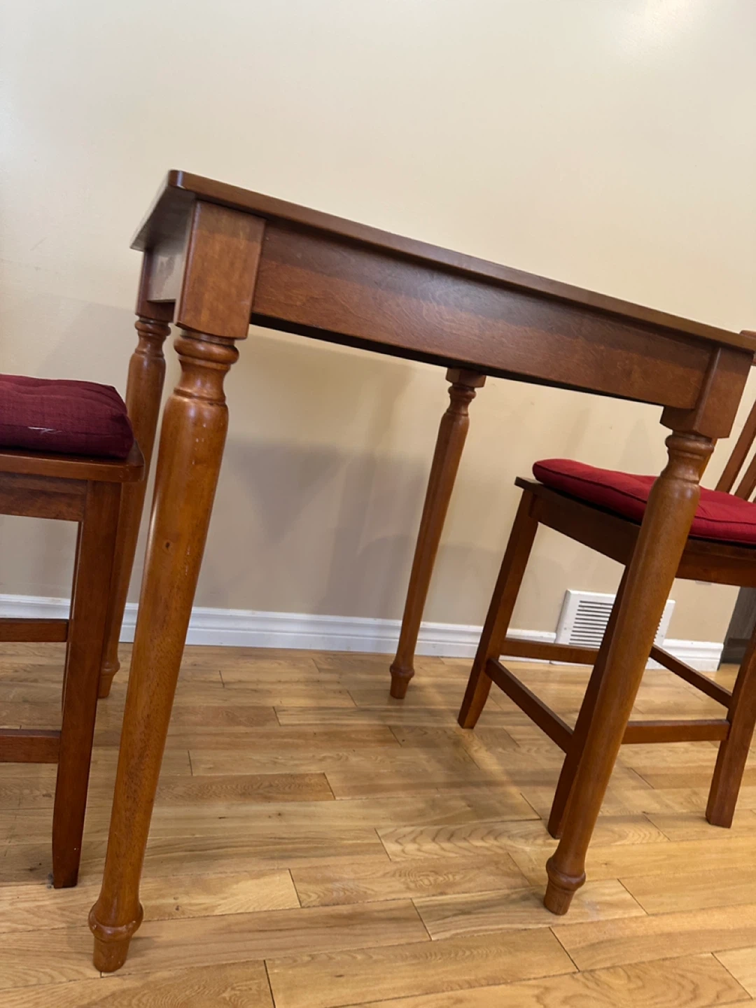 Square counter-height dining table with two matching chairs. Made of solid wood with a warm honey-toned finish. Sturdy, compact, and perfect for small kitchens, condos, or breakfast nooks.