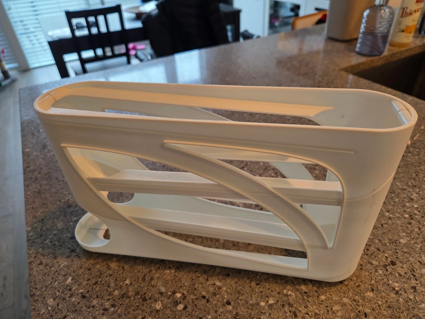 This white egg organizer rack is made of plastic. It holds up to 30 eggs and measures 12.9 inches long, 7 inches wide, and 7.8 inches tall. It's great for keeping your fridge tidy!