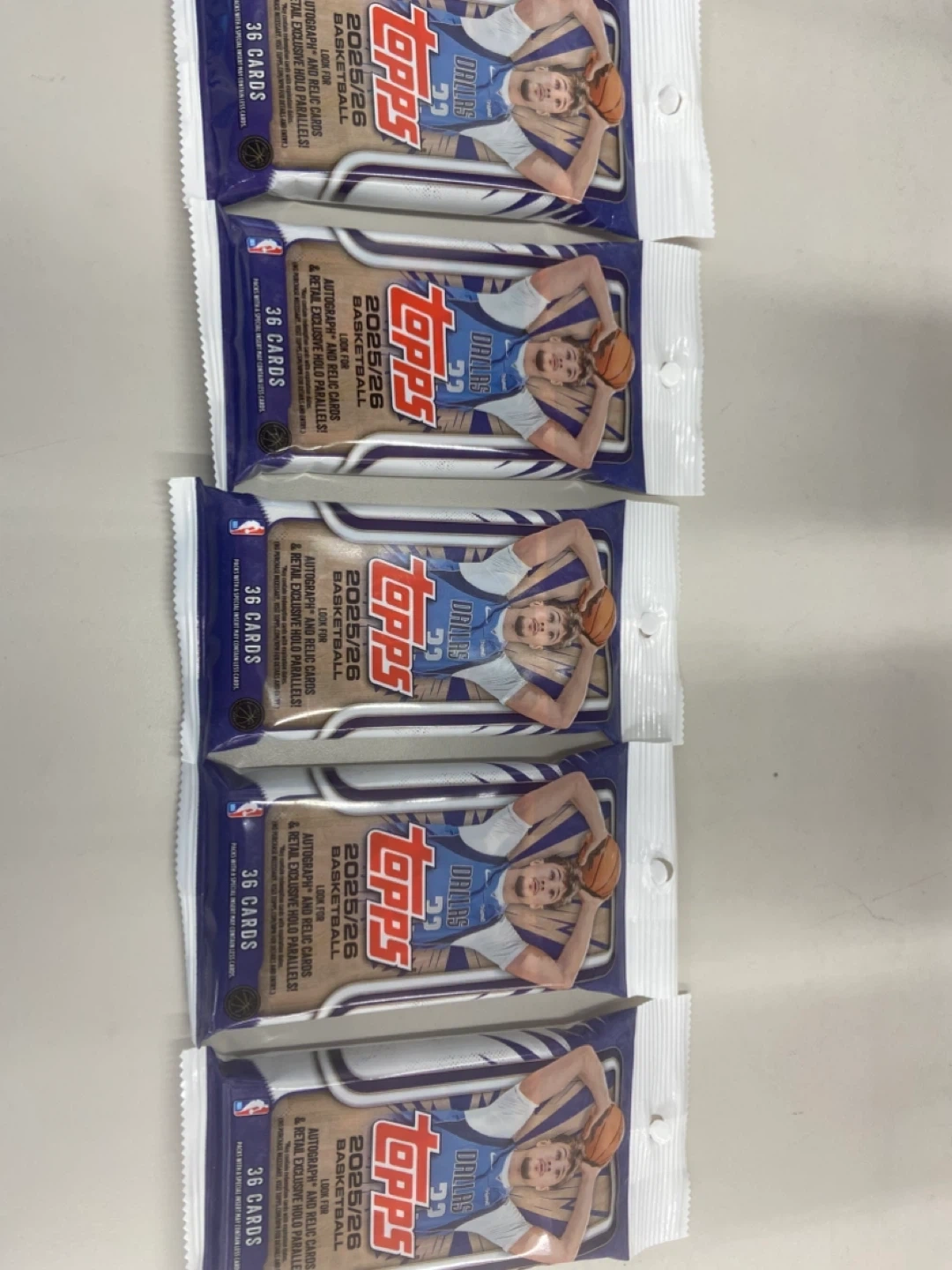 Grab yourself a lot of five Topps 2025/26 basketball card packs! Each pack contains 36 cards, with a chance to find autographs, relic cards, and retail exclusive holo parallels. Look for special inserts in some packs!