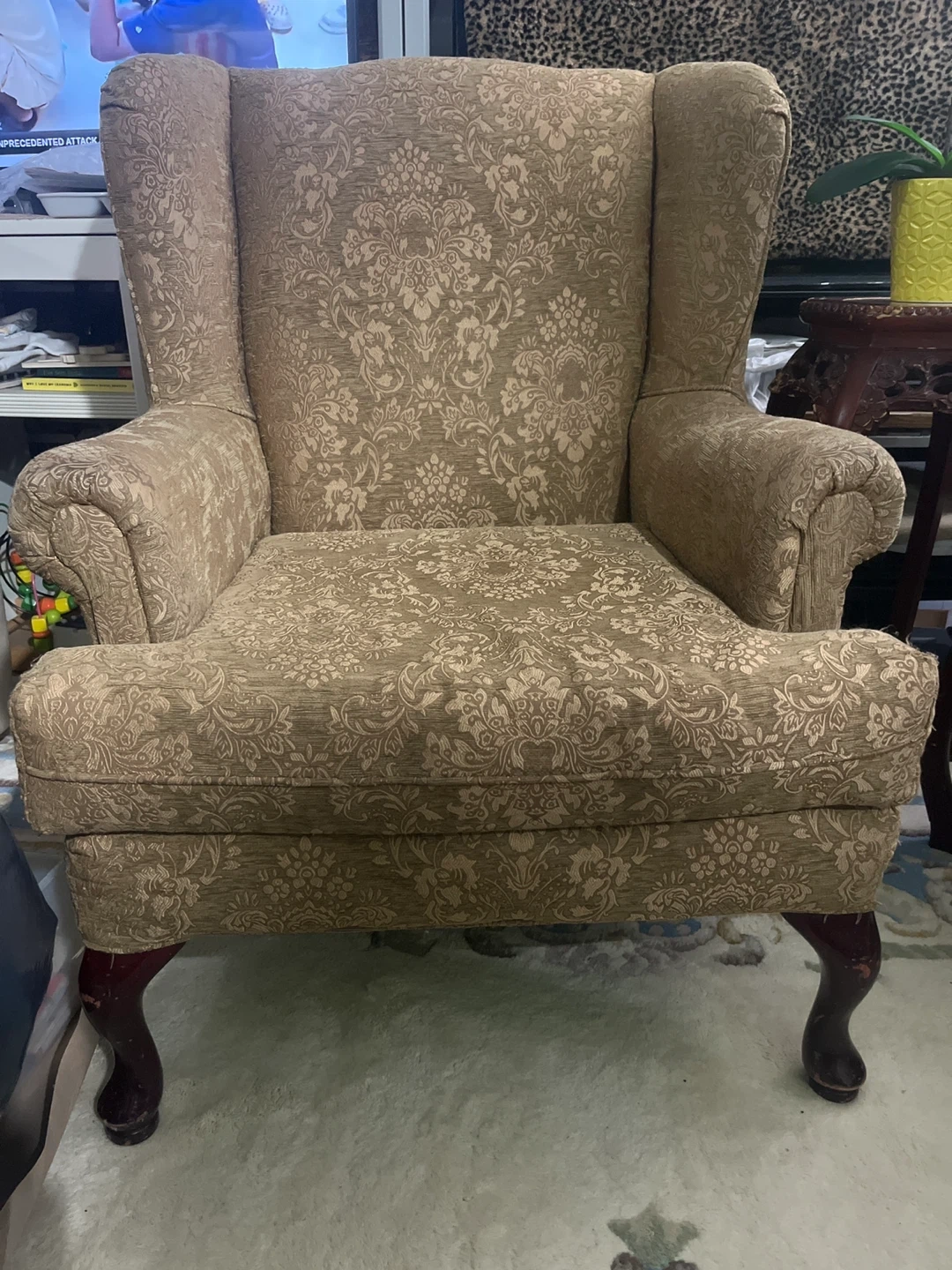 This wingback armchair features a classic damask floral pattern in neutral tones. Its sturdy wooden legs add a touch of elegance. It's upholstered in a durable fabric. This chair provides a cozy spot to relax.