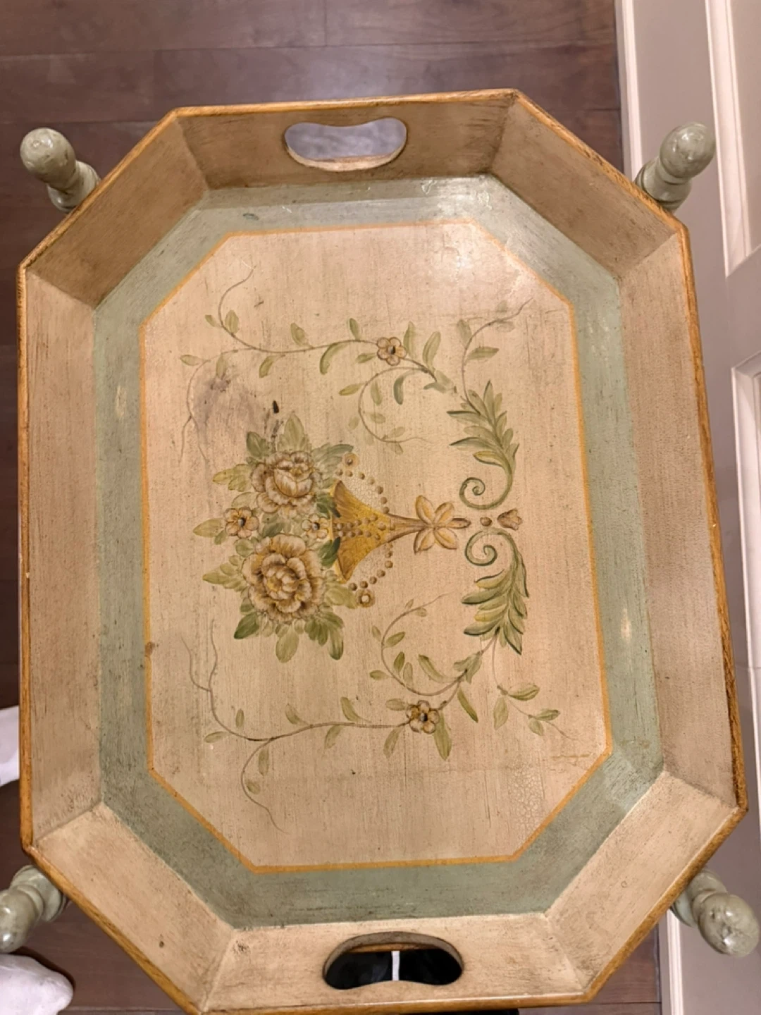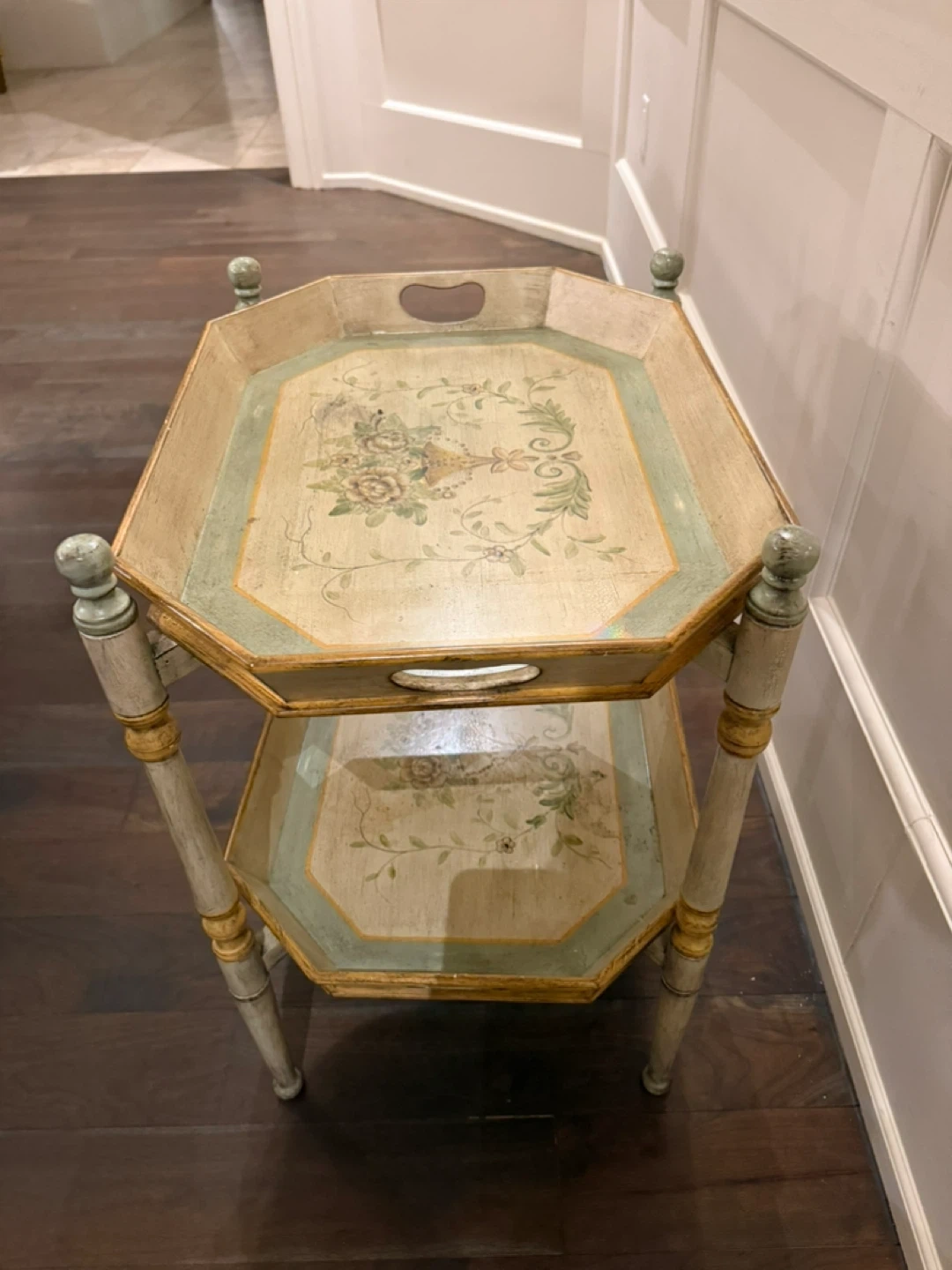 This decorative two-tiered tray table features a floral painted design on both octagonal surfaces. It has cut-out handles on the top tray and sits on four turned legs. Wood construction with a distressed painted finish. Perfect for serving snacks or displaying decor!