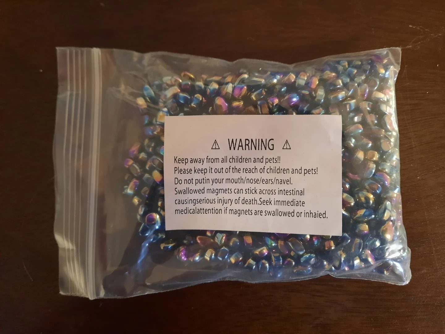 Bag of small, iridescent decorative magnets. These are not toys and are not suitable for children or pets. Handle with care and keep away from small openings. Seek medical attention if swallowed.