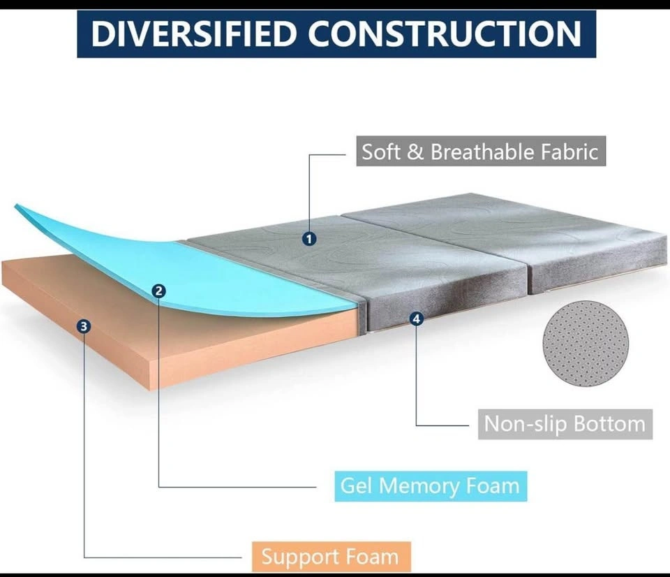 Comfy full size tri-fold mattress. Brand new, still in plastic wrap. Medium firmness, great for guests or camping. Made with gel memory foam and support foam, plus a soft breathable fabric. Bottom is non-slip.