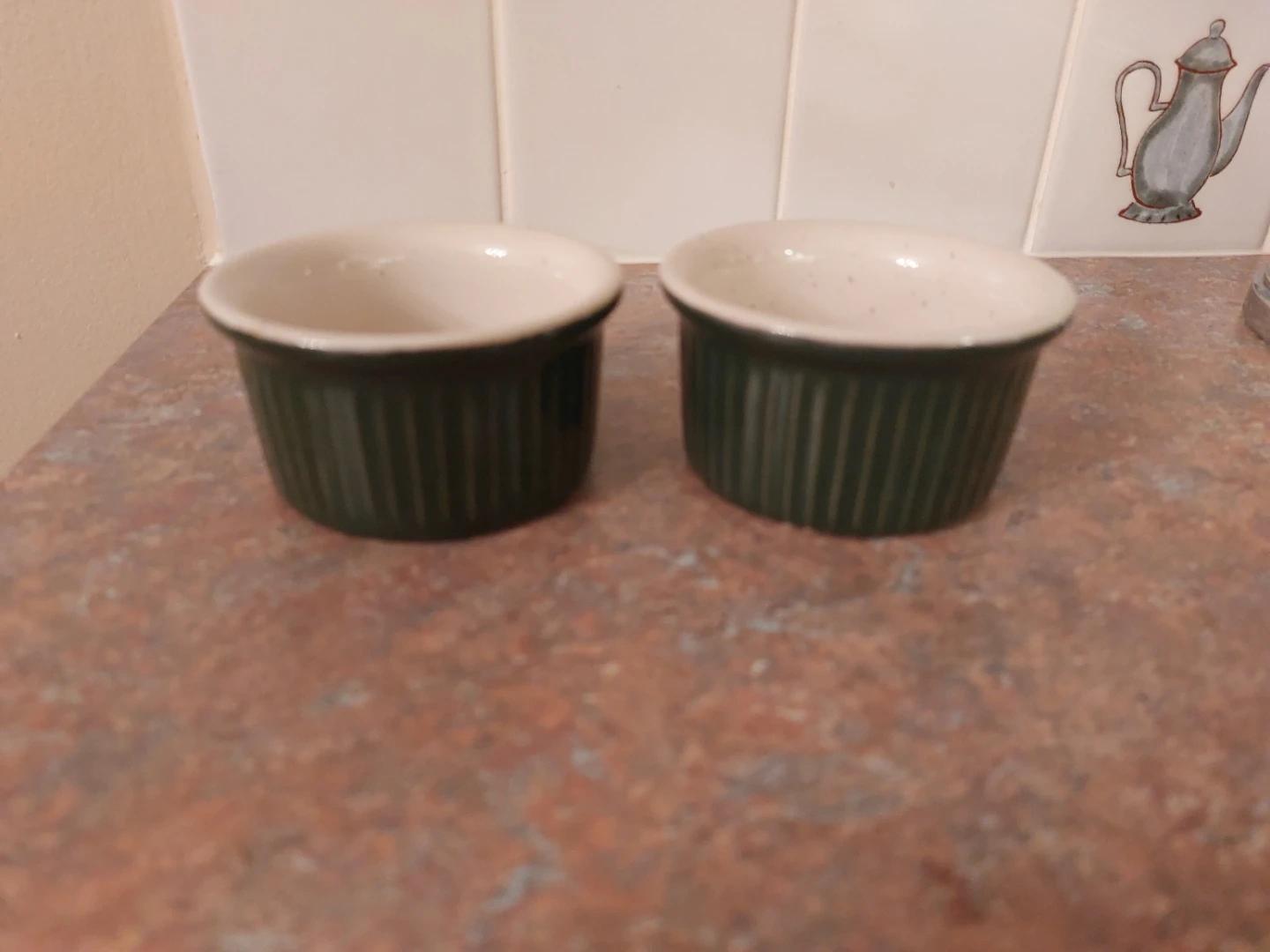 $10 - Here's a set of two ramekins. They're a lovely cream colour with speckles on the inside and dark green on the outside. Great for baking or serving. 3 inches in diameter.