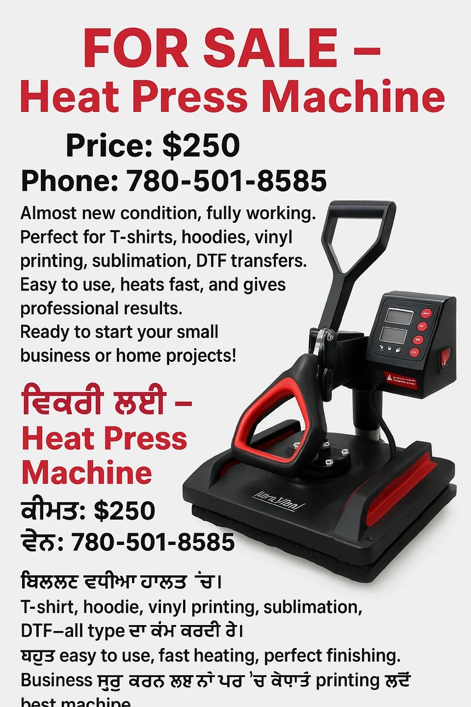 Almost new condition, fully working heat press machine. It's perfect for T-shirts, hoodies, and vinyl printing. Easy to use and heats fast!