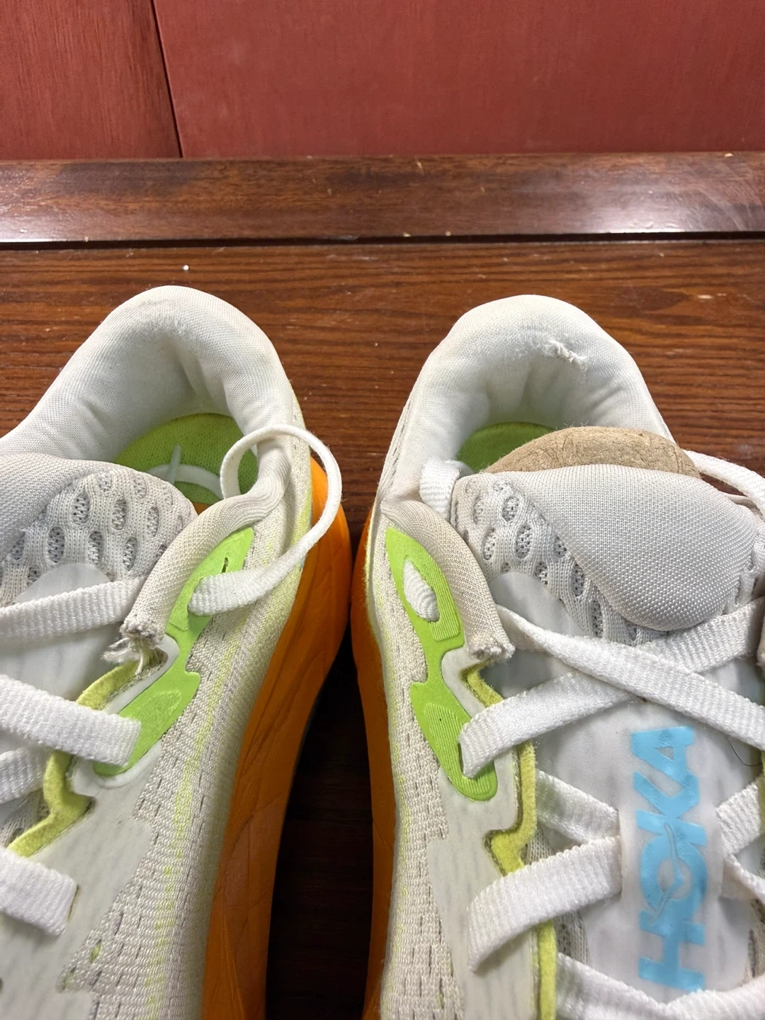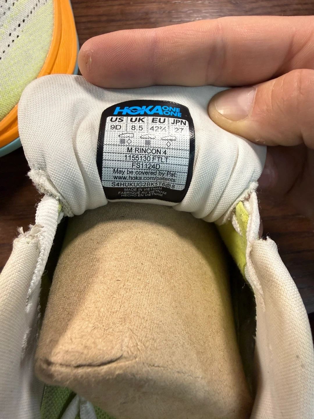 I'm selling a pair of Hoka One Men's Rincon 4 running shoes, size US 9D, style FTLT 1155131. These running shoes feature a lightweight design for a fast and responsive feel, perfect for training or racing. They show signs of wear from previous use but still have plenty of miles left.