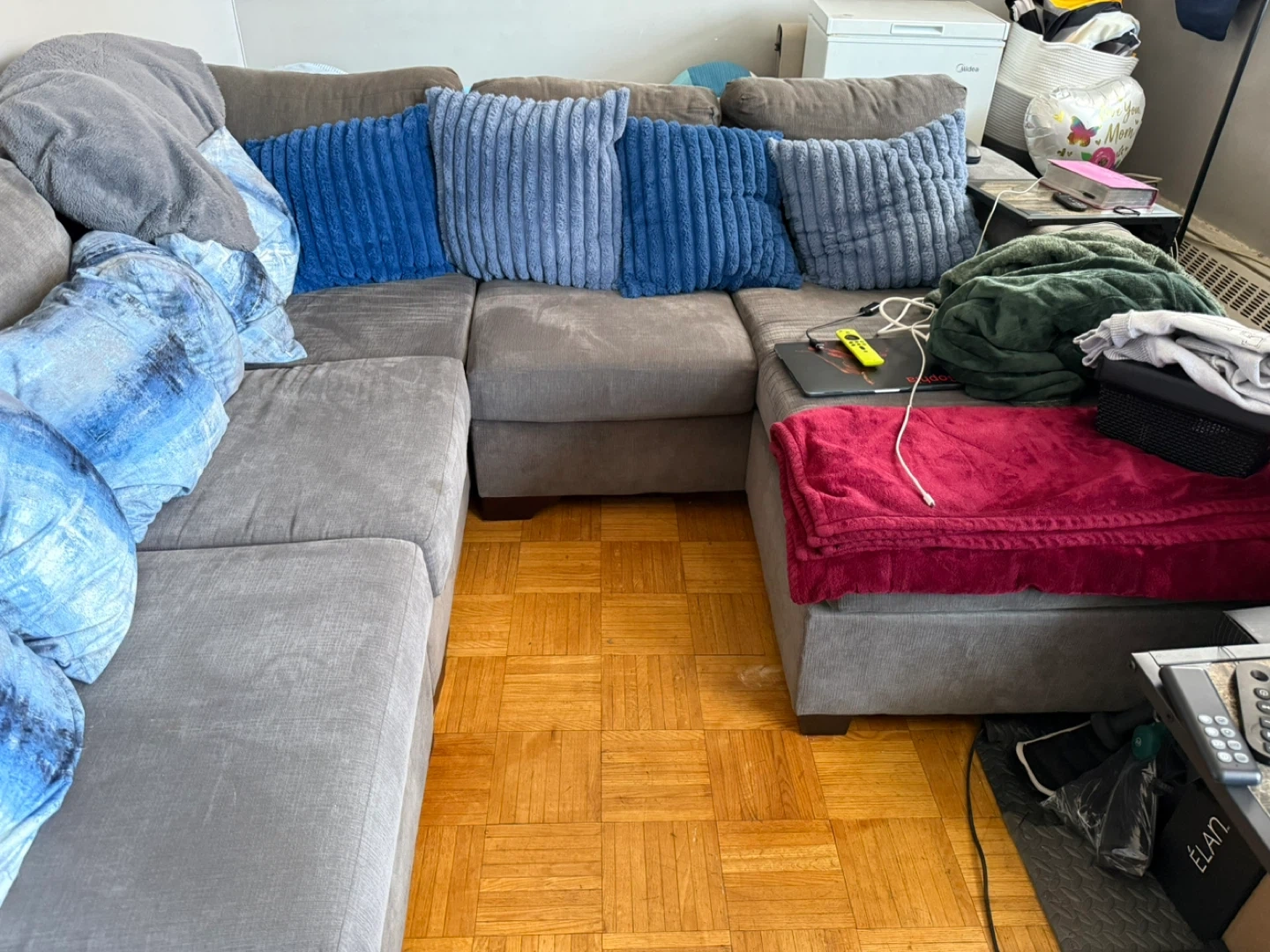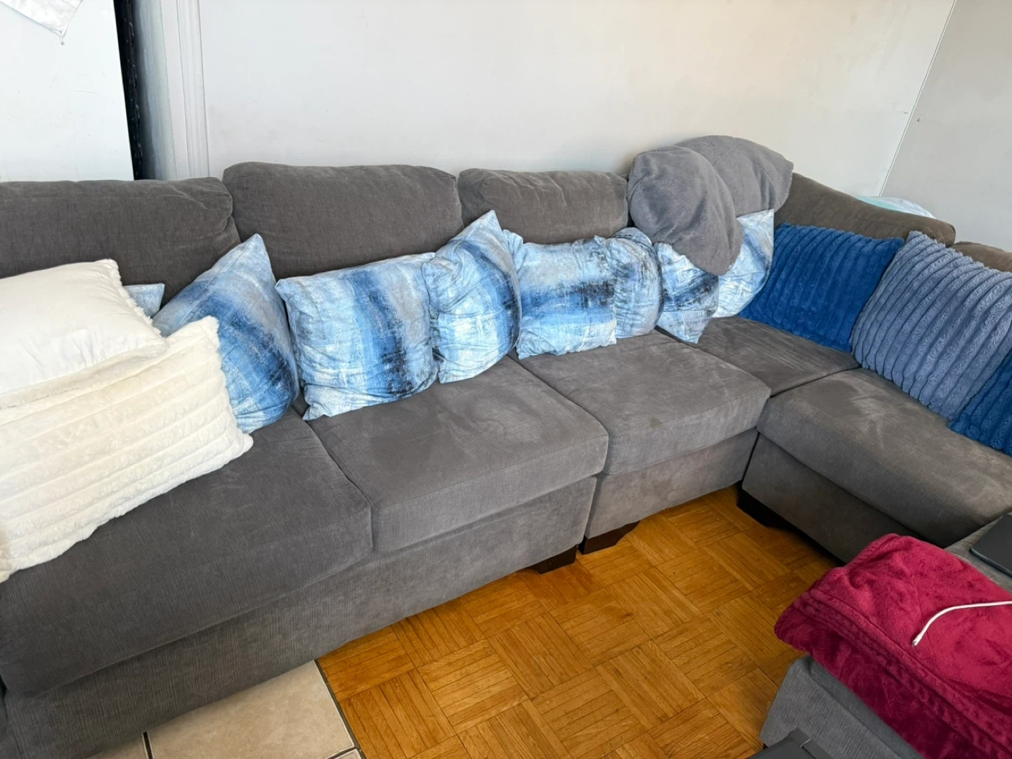 Spacious grey sectional couch. Features plush seating and includes an assortment of decorative accent pillows in blue and white patterns. Plenty of seating room for a family or guests.
