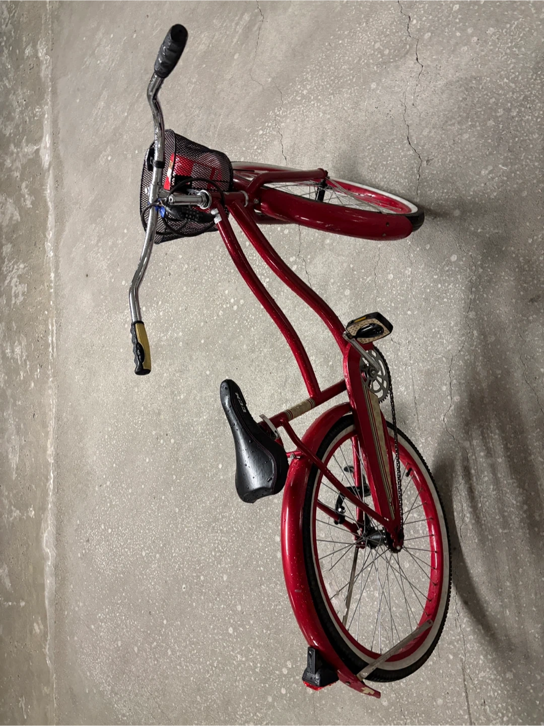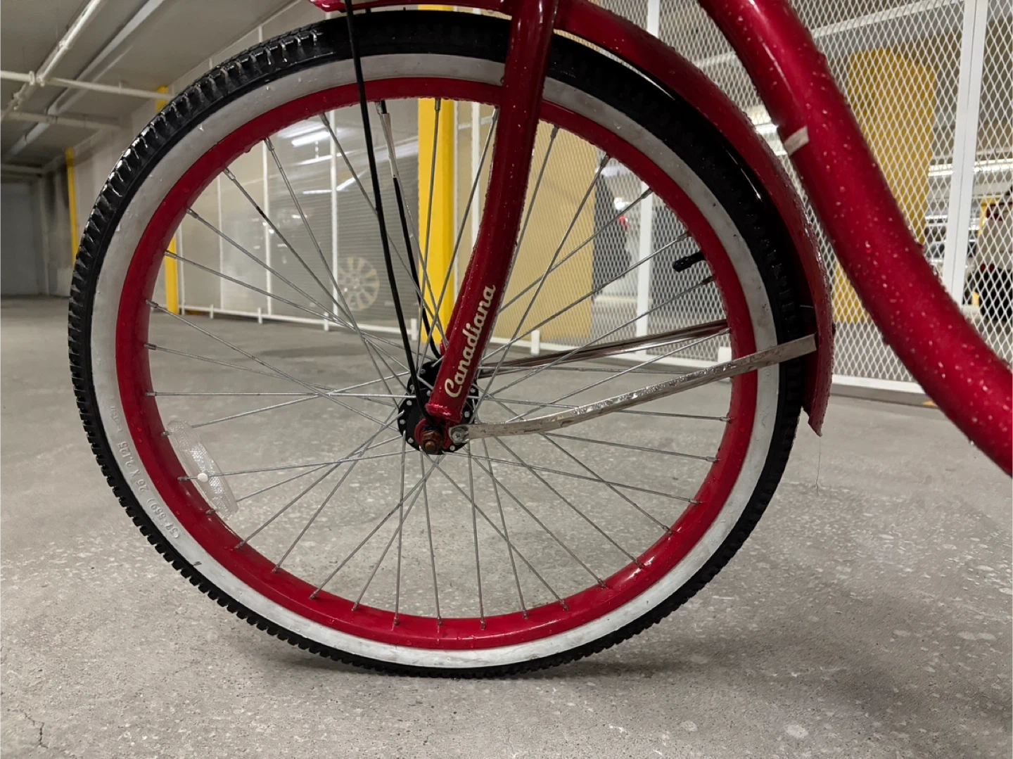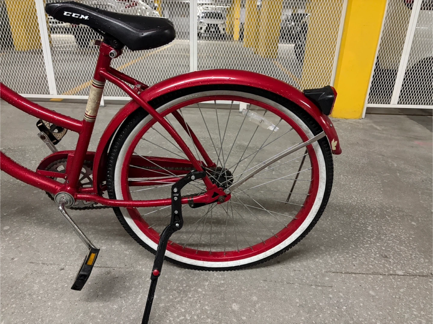 This red CCM cruiser bicycle is a classic style for comfortable rides. It features a front basket for convenience. It's perfect for leisurely trips around the neighbourhood.
