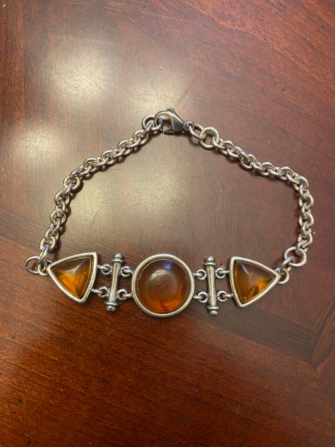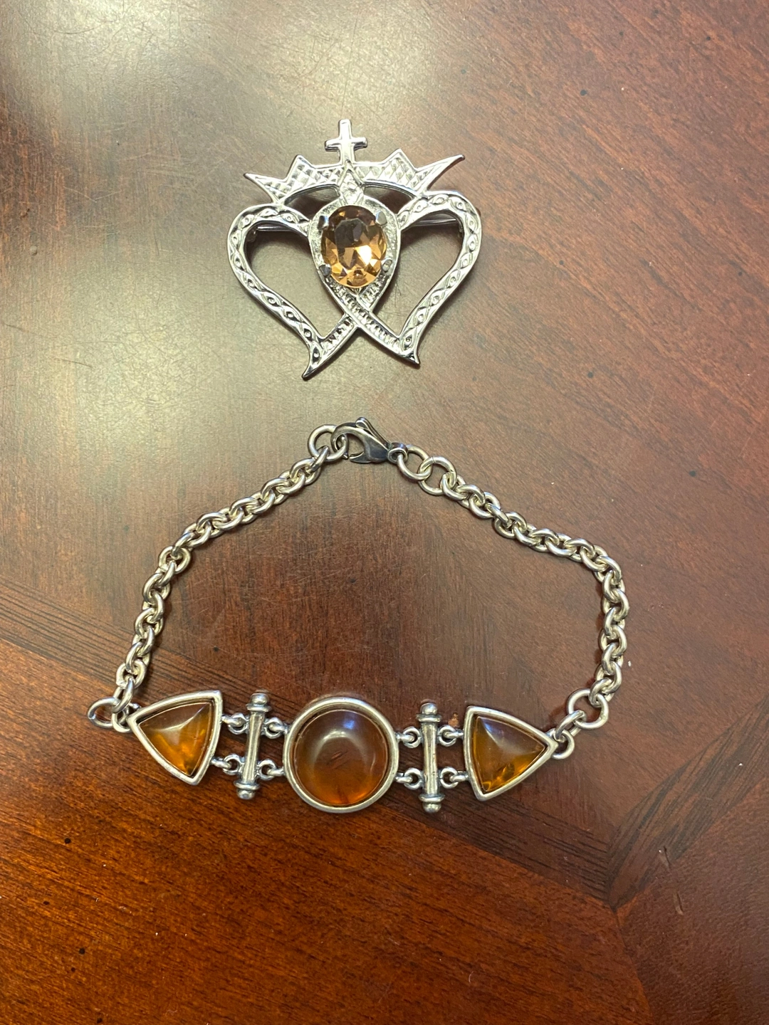 The bracelet has amber-coloured stones in triangular and round settings. Both pieces are in good condition and have a unique, vintage charm. The bracelet appears to be stamped 925
