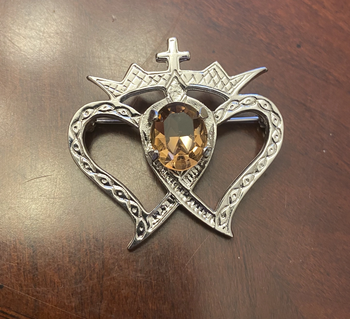 The brooch features a heart and crown design with a central amber-coloured stone.