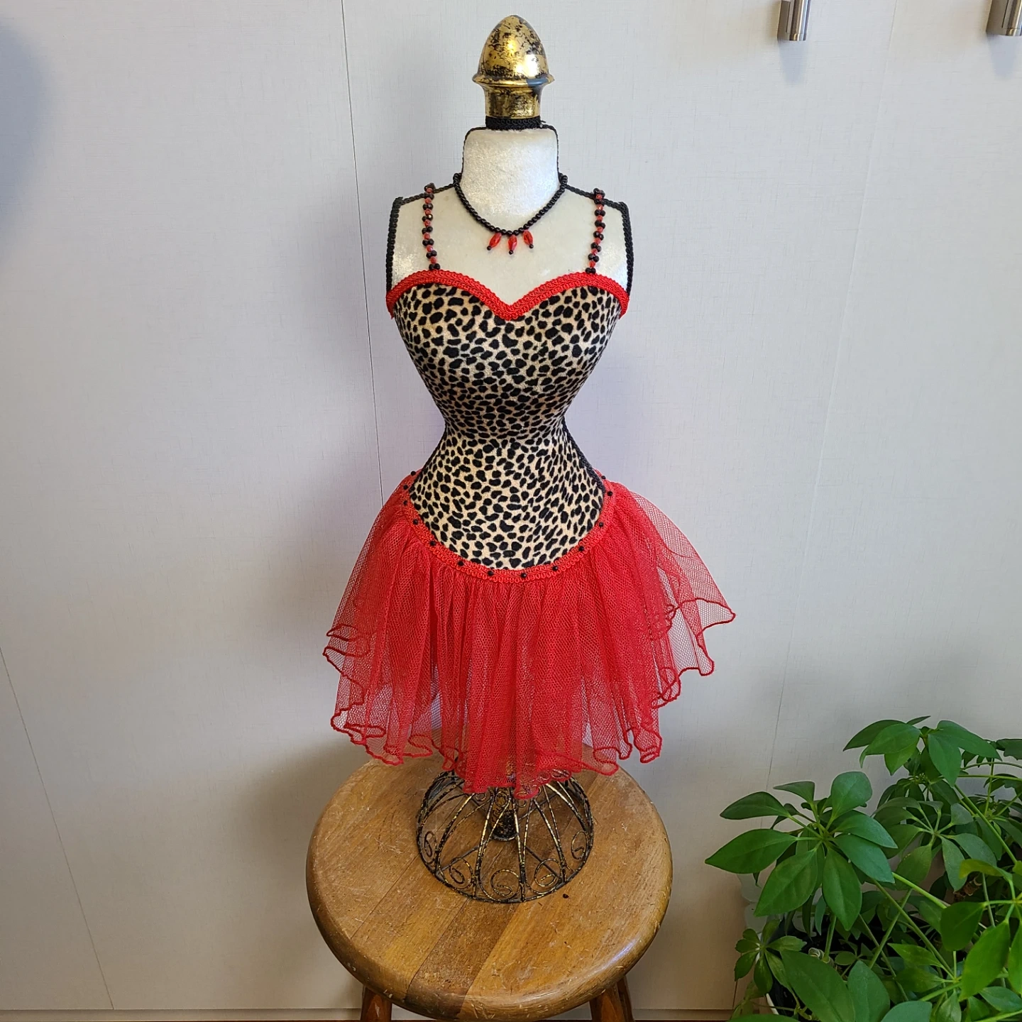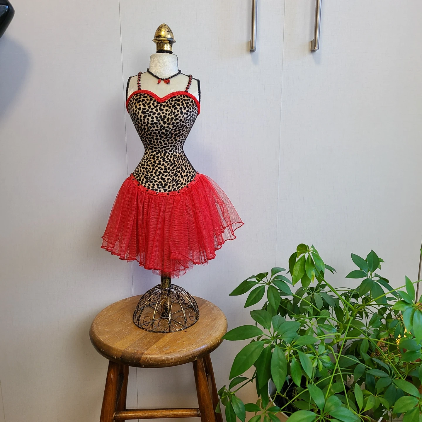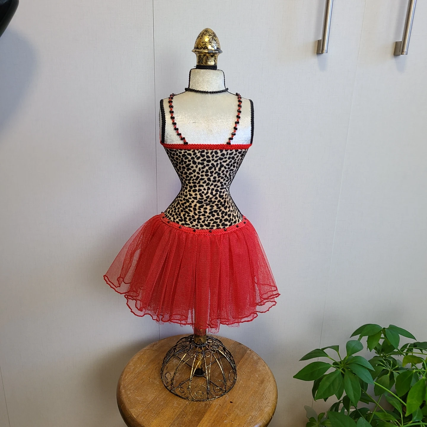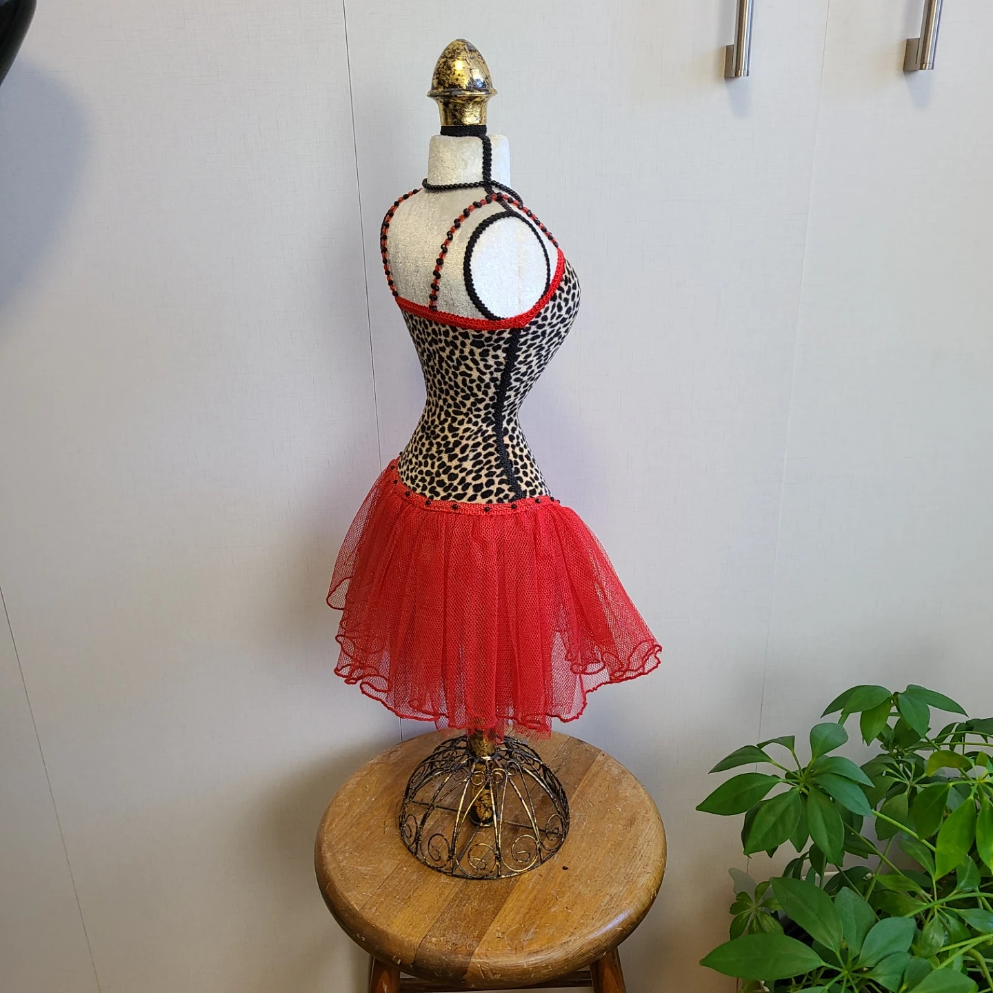 This decorative mannequin showcases a leopard print bodice with a sweetheart neckline and a vibrant red tulle skirt. It features a beaded necklace detail. It's a fun piece for displaying accessories or as a quirky decor item!