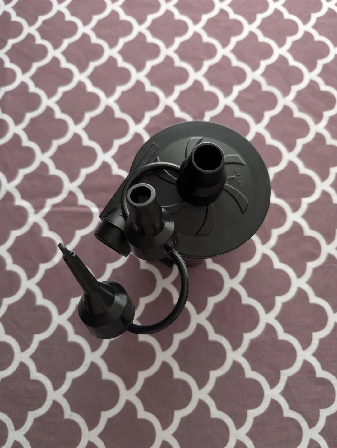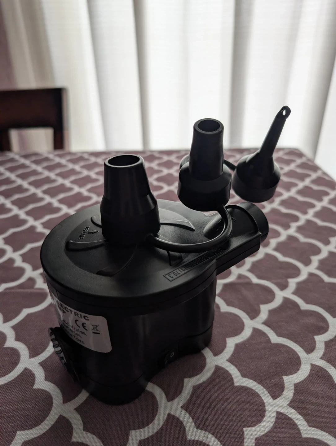 Battery-powered DC electric air pump. It's a double-action pump that inflates and deflates. It operates on D-cell batteries and is suitable for airbeds and inflatable toys.