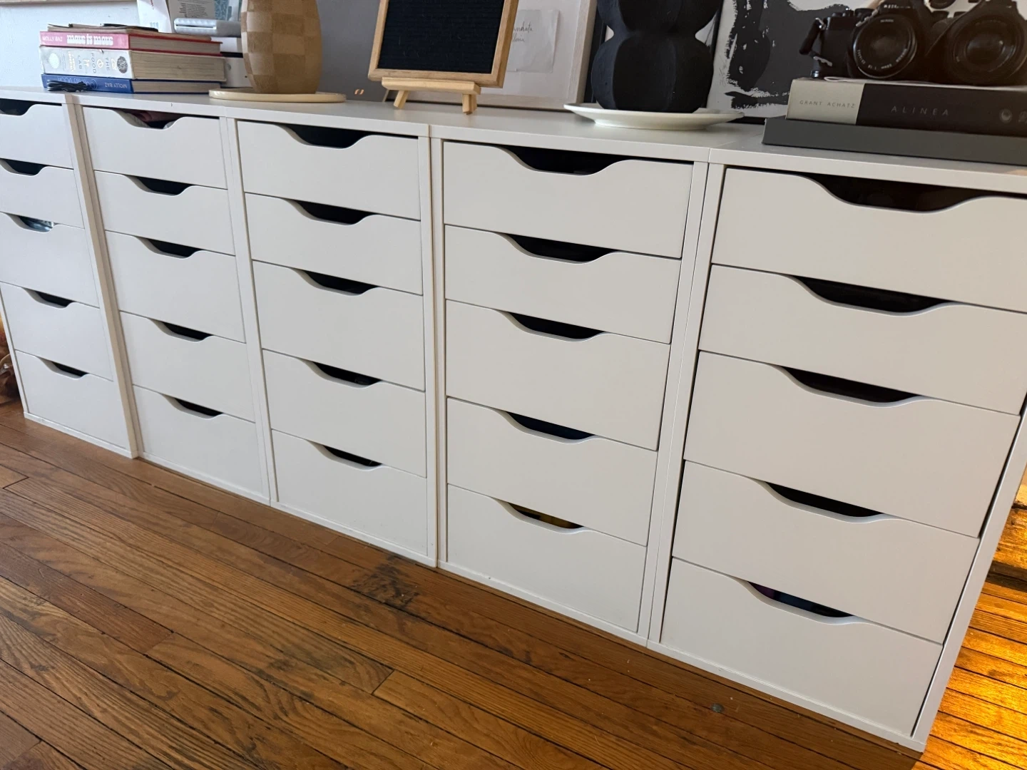 White IKEA Alex drawer unit with multiple drawers. Perfect for organizing art supplies or craft materials. It's a versatile storage solution for any room! 5 available for sale. Discount for the whole lot. Originally $120 each