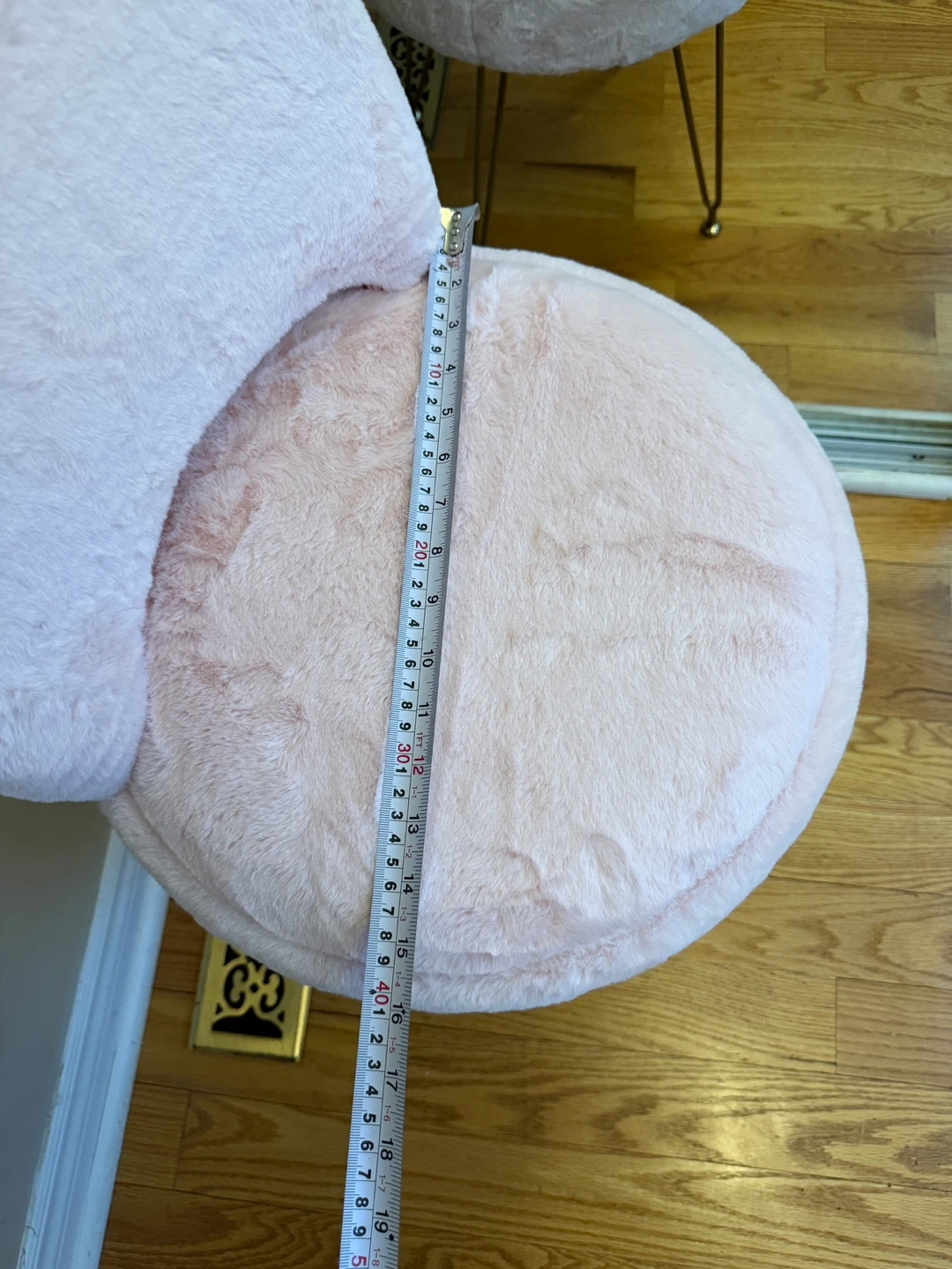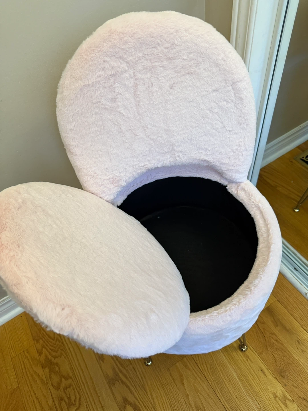 This cute pink vanity stool is covered in soft faux fur and features a convenient storage compartment inside and foldable back.