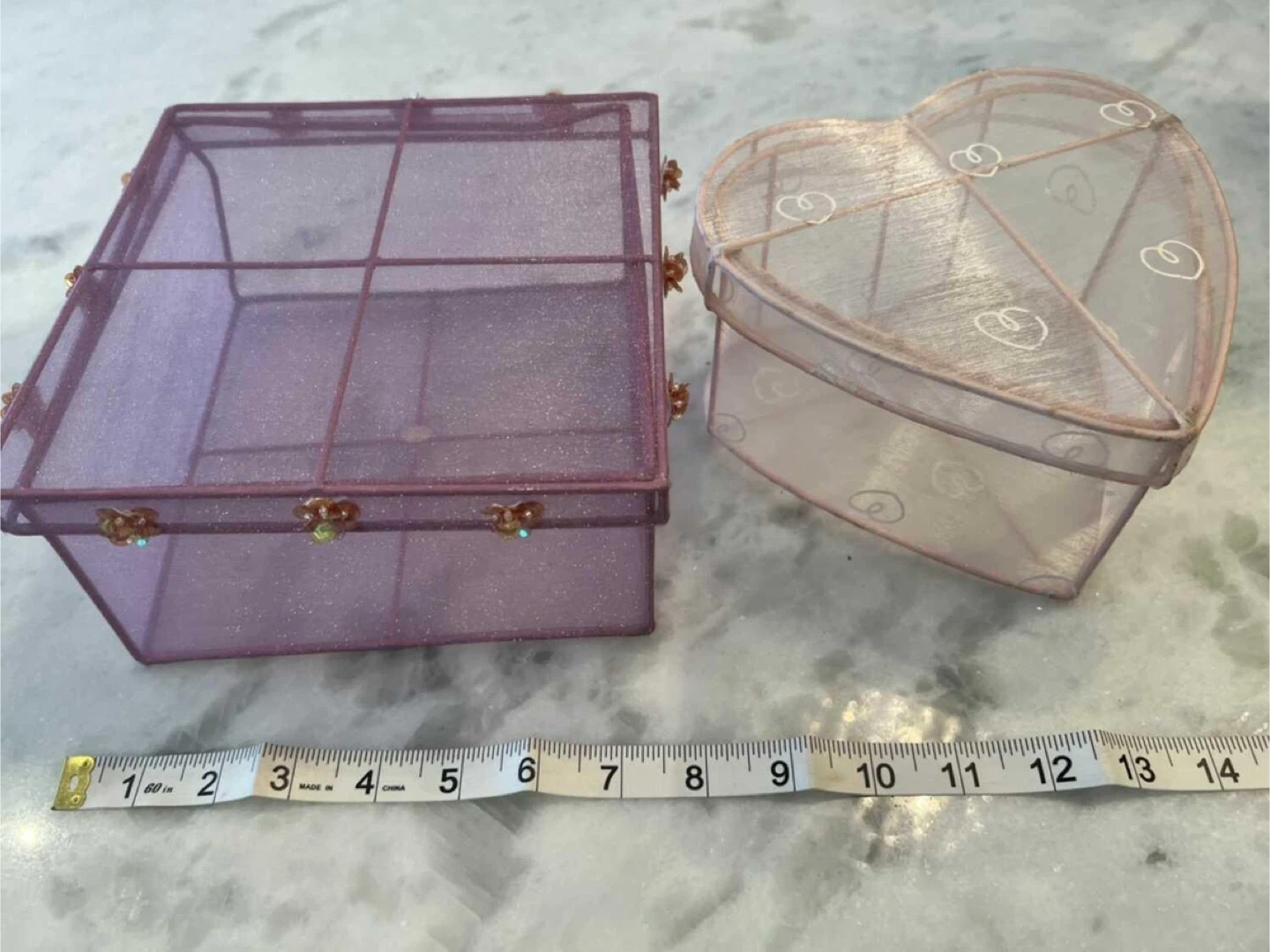Two decorative storage boxes included: one square and one heart-shaped. Both are made of sheer glitter mesh fabric with wire frames and decorative floral accents.
