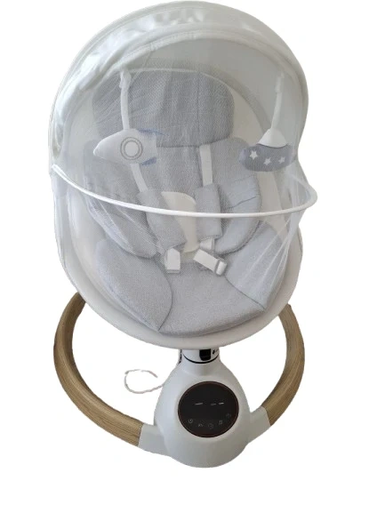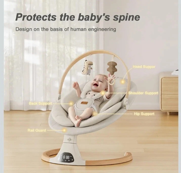 This baby swing rocker features a comfortable, supportive design with head, shoulder, and hip support. It includes music functions and comes with a remote control for convenience. The design protects the baby's spine, offering a safe and soothing experience.