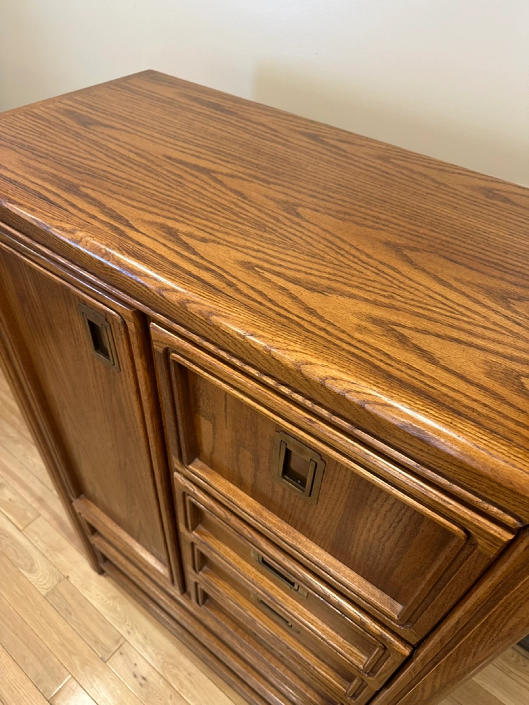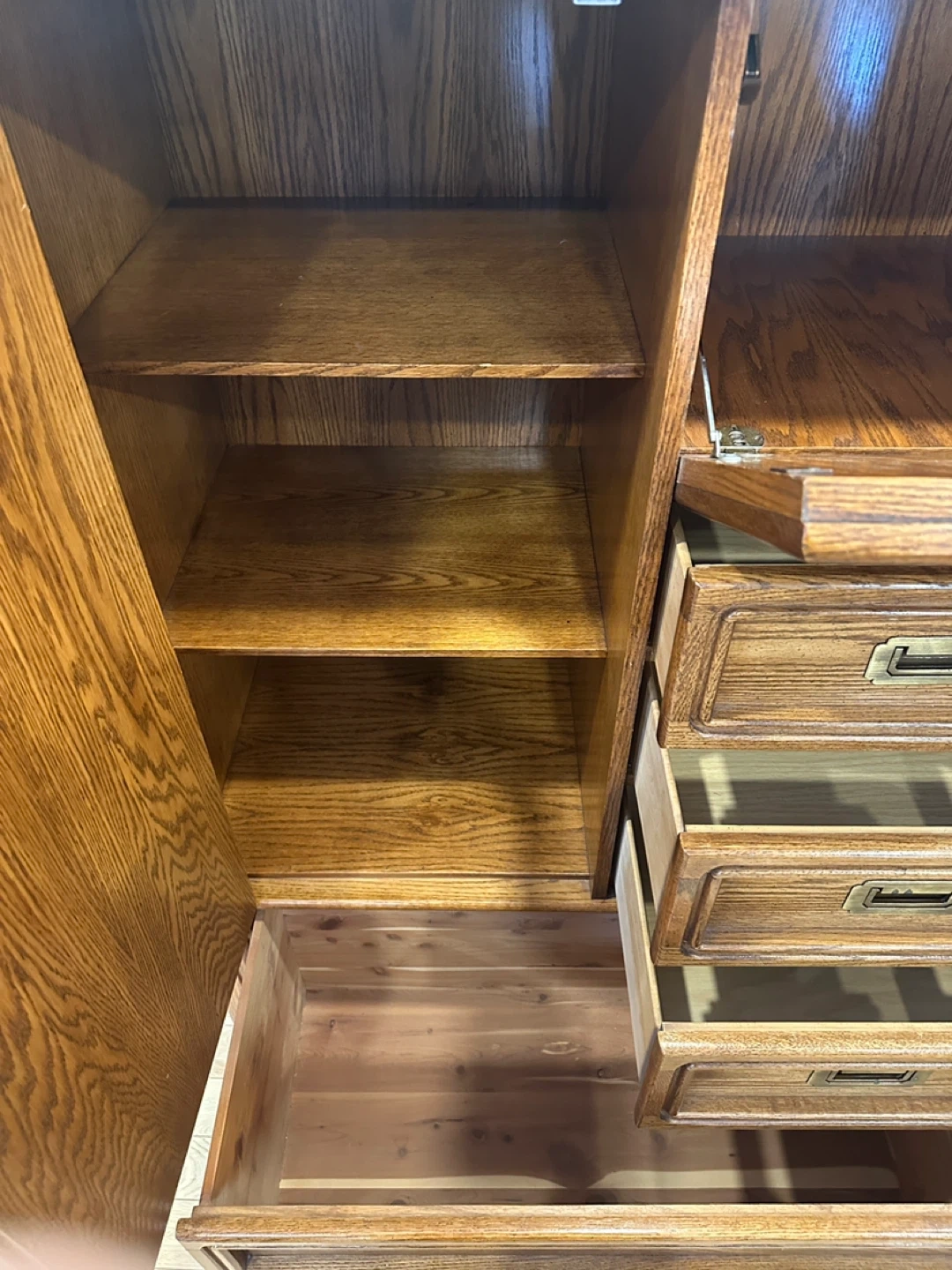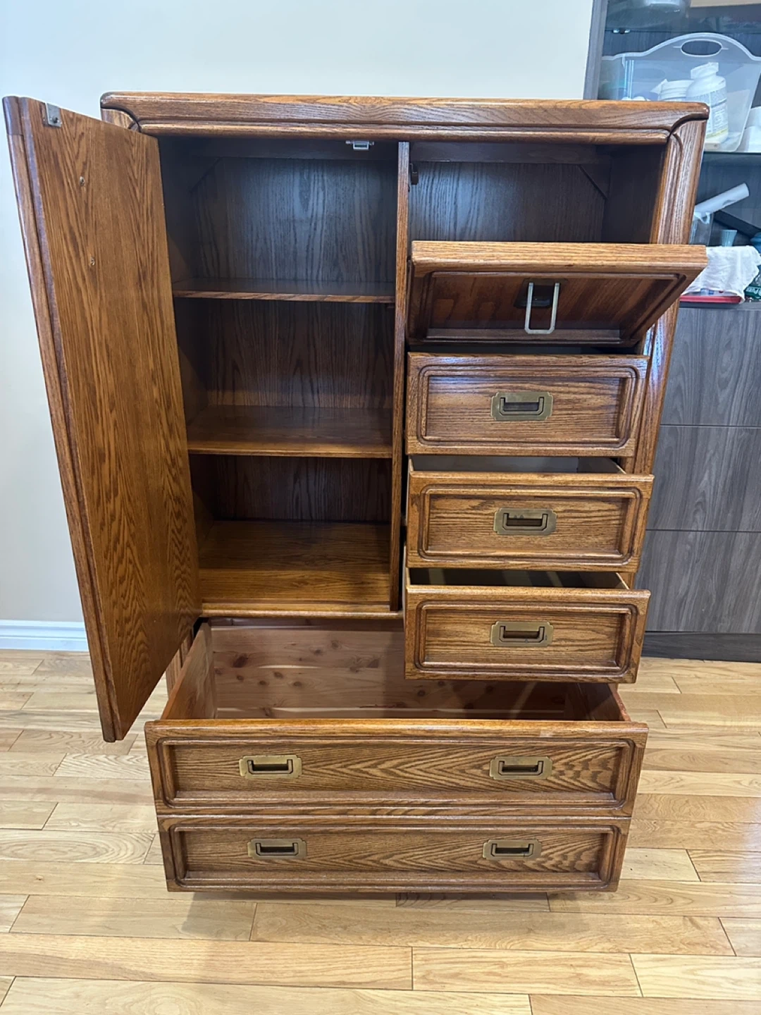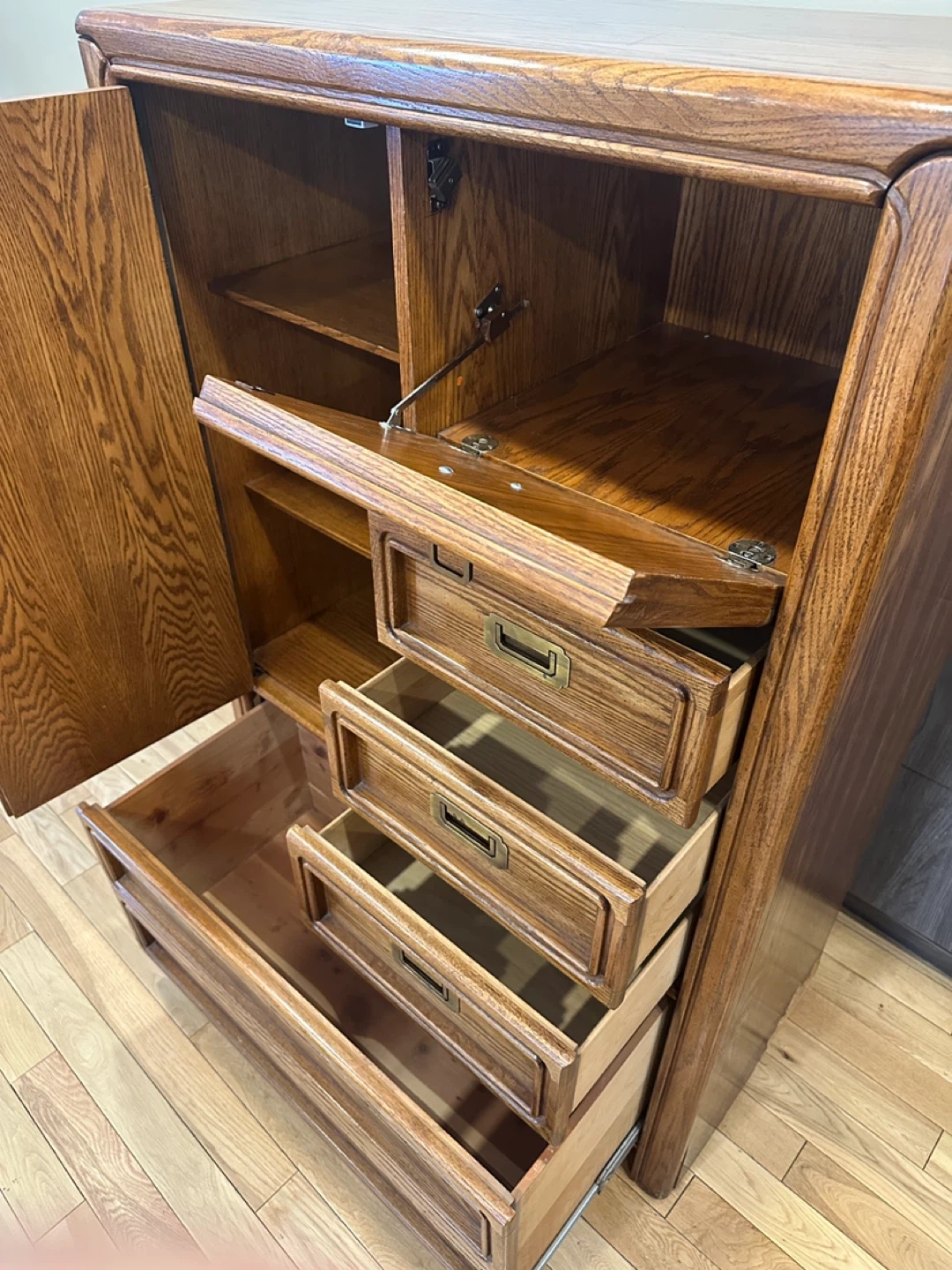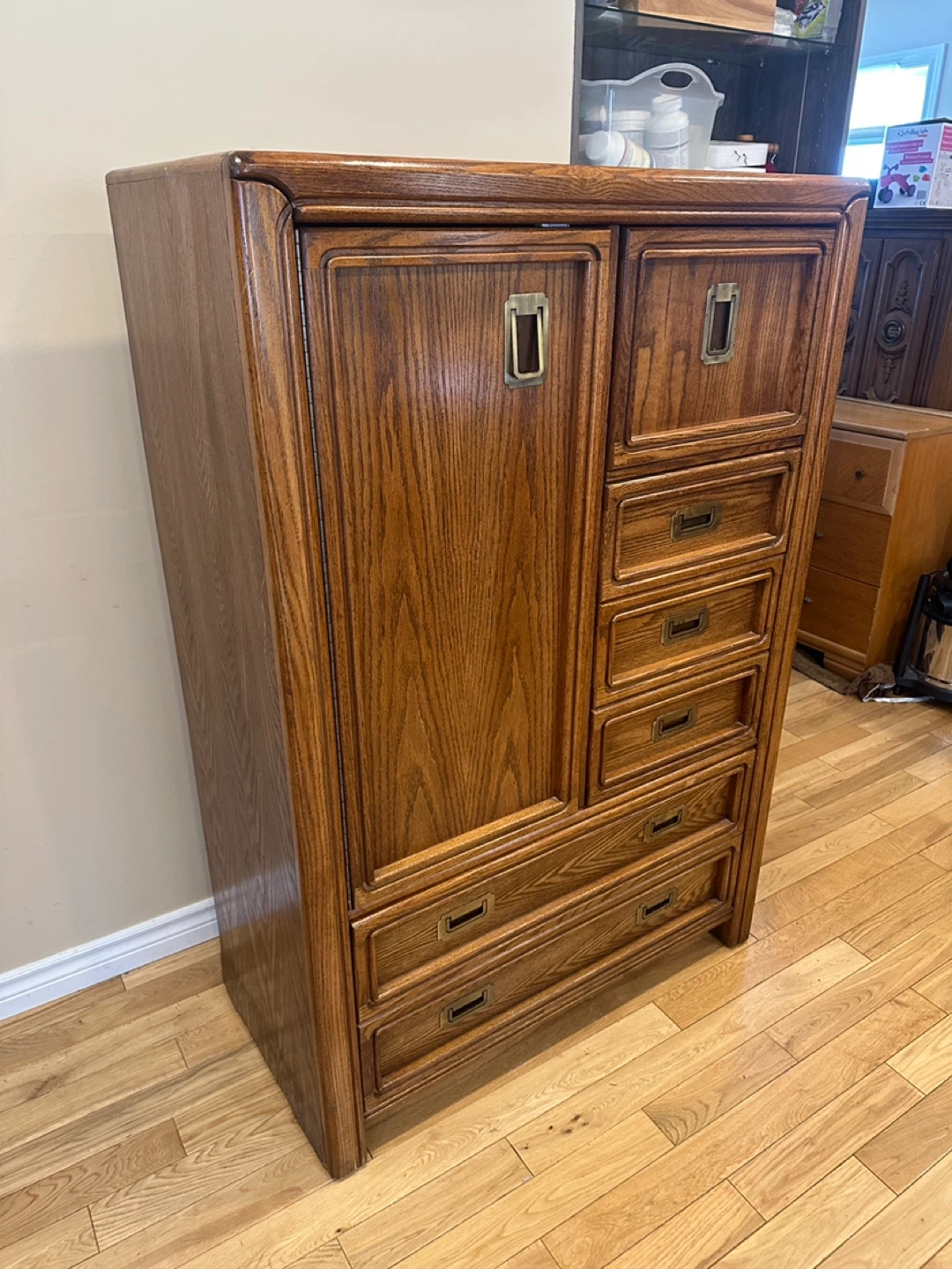 Vintage tall wardrobe dresser with cabinet storage, drawers, and a drop-front compartment. Solid, functional piece with classic oak finish.